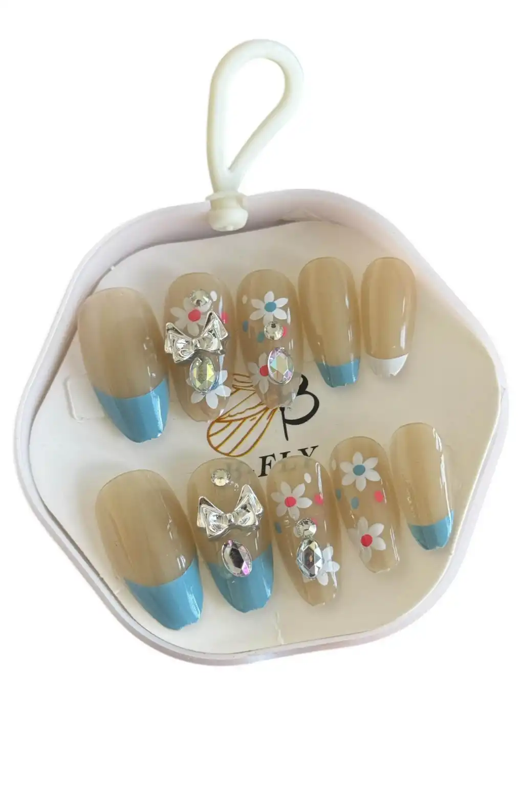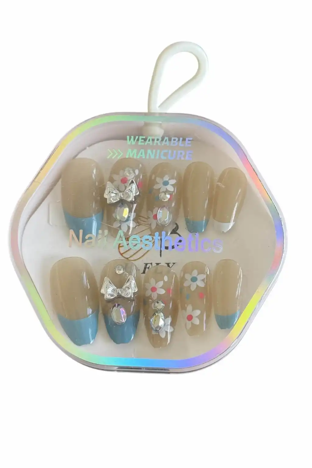 10'lu Krem Ve Mavi Renk Çiçek Figürlü Taş Detaylı Takma Tırnak Set (Yapıştırıcılı)