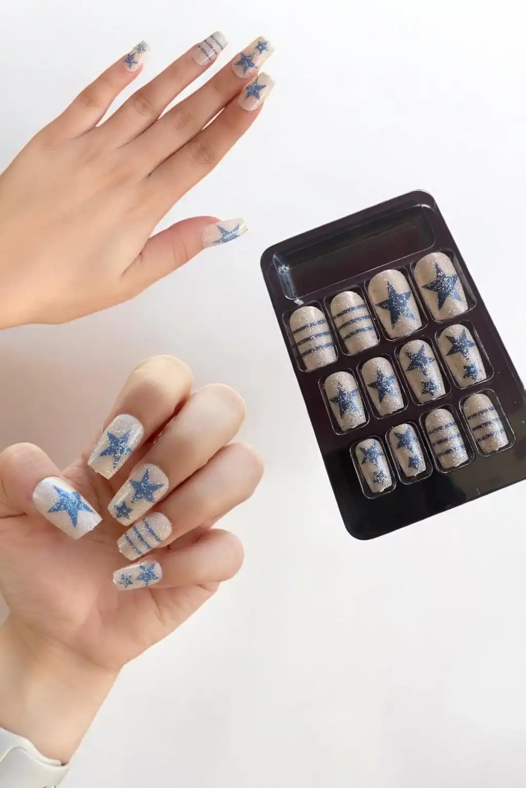 12'li Beyaz Ve Mavi Renk Yıldız Figürlü Takma Tırnak