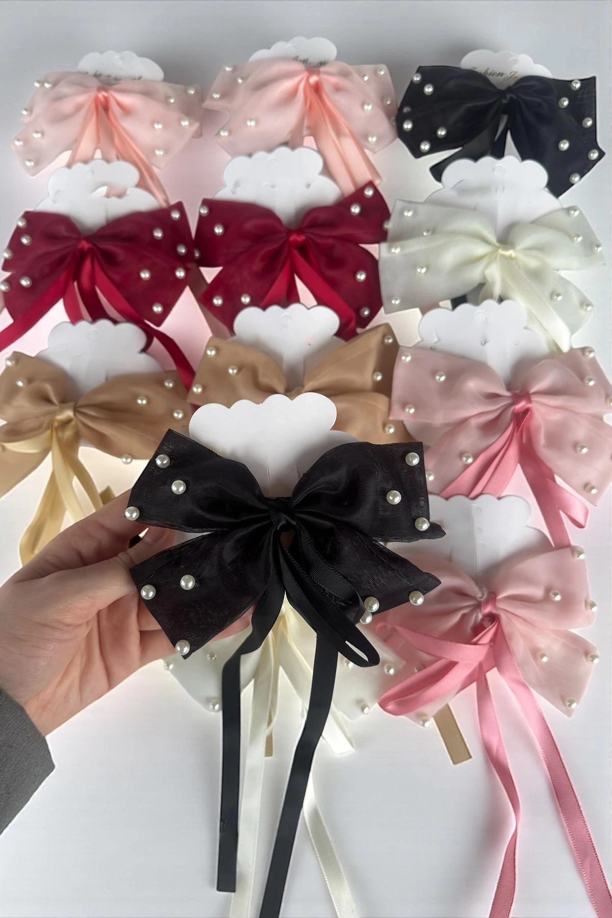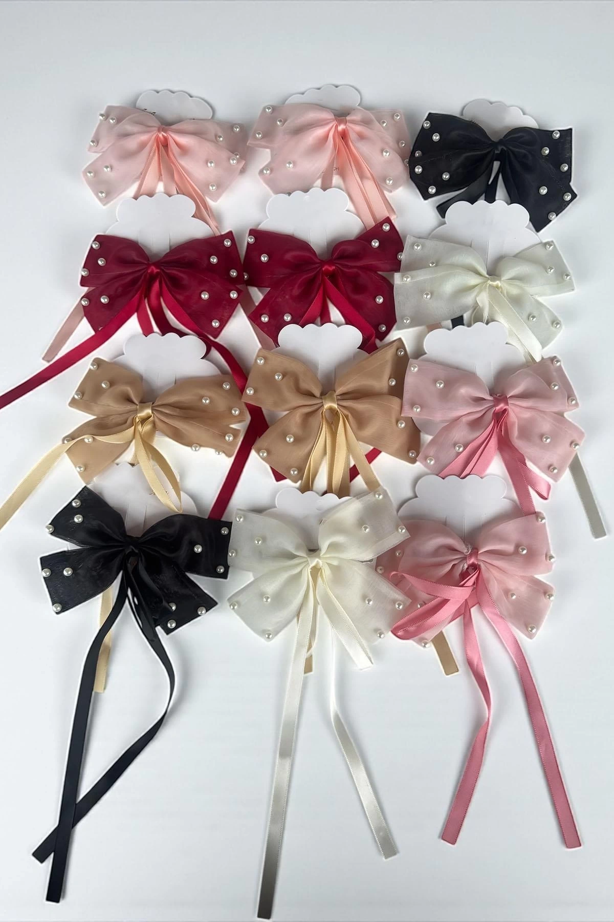 12'li Karışık Renk Kurdele Figürlü İnci Detaylı Otomat Toka Set