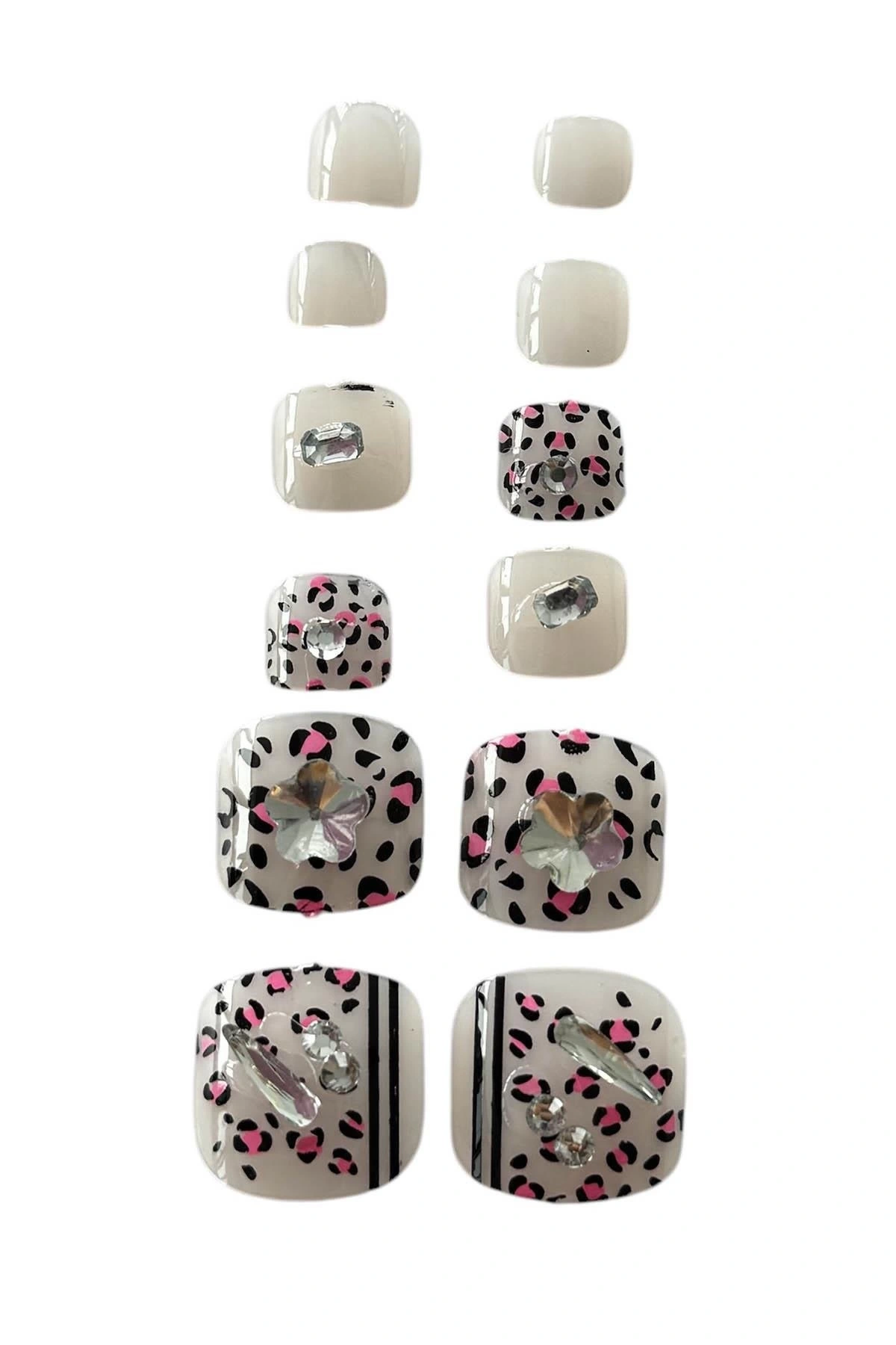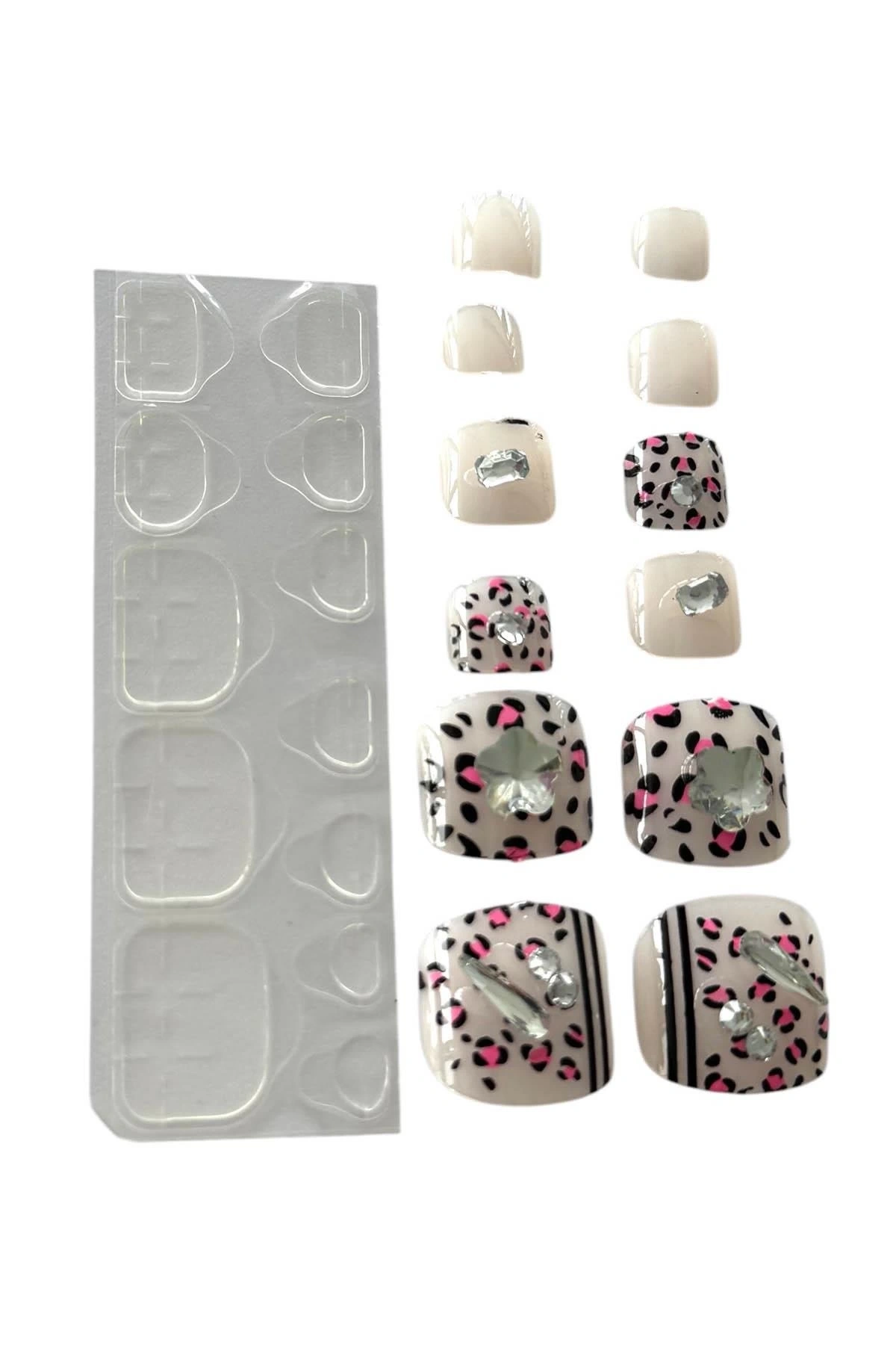12'li Karışık Renk Leopar Desenli Taş Detaylı Ayak Takma Tırnak
