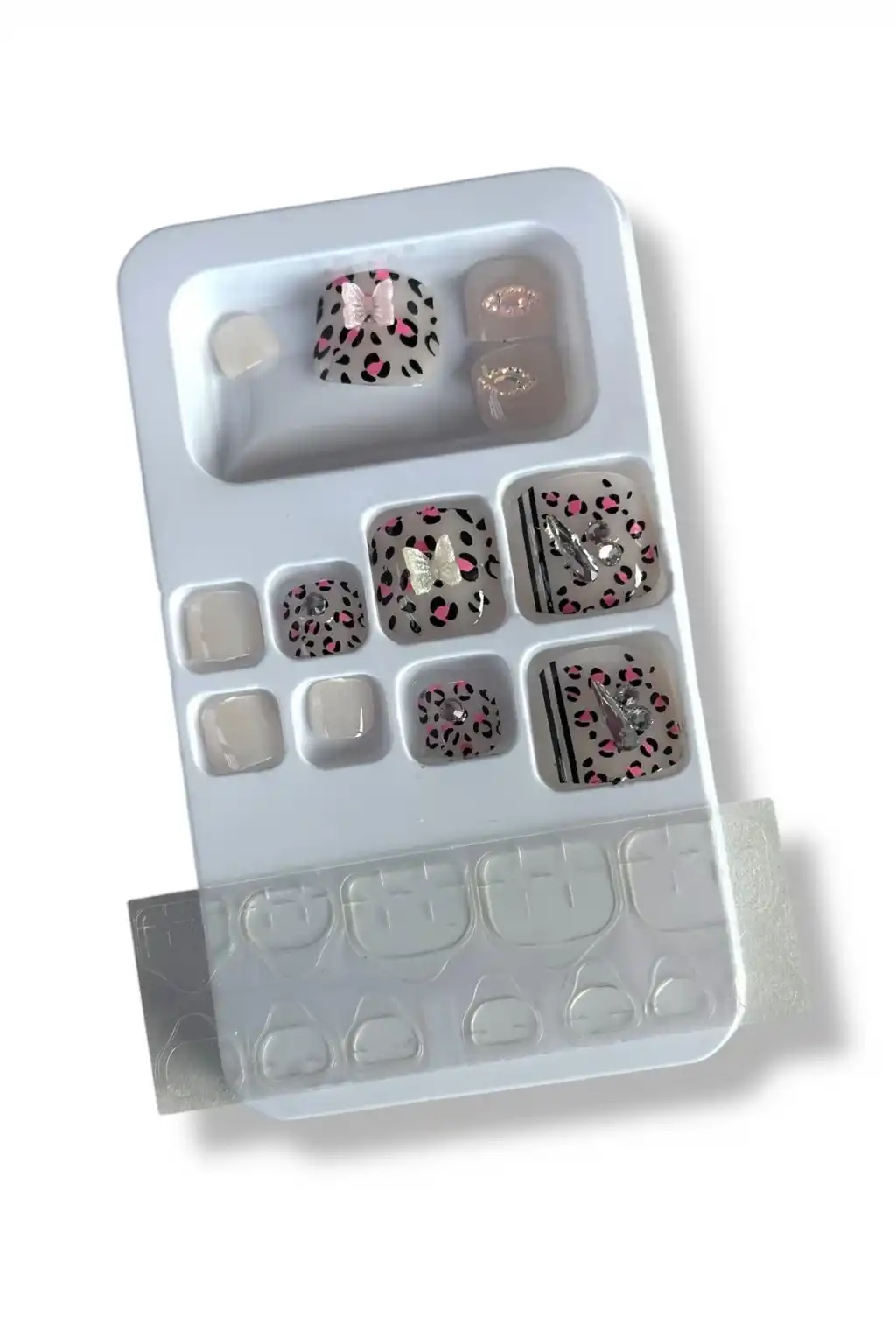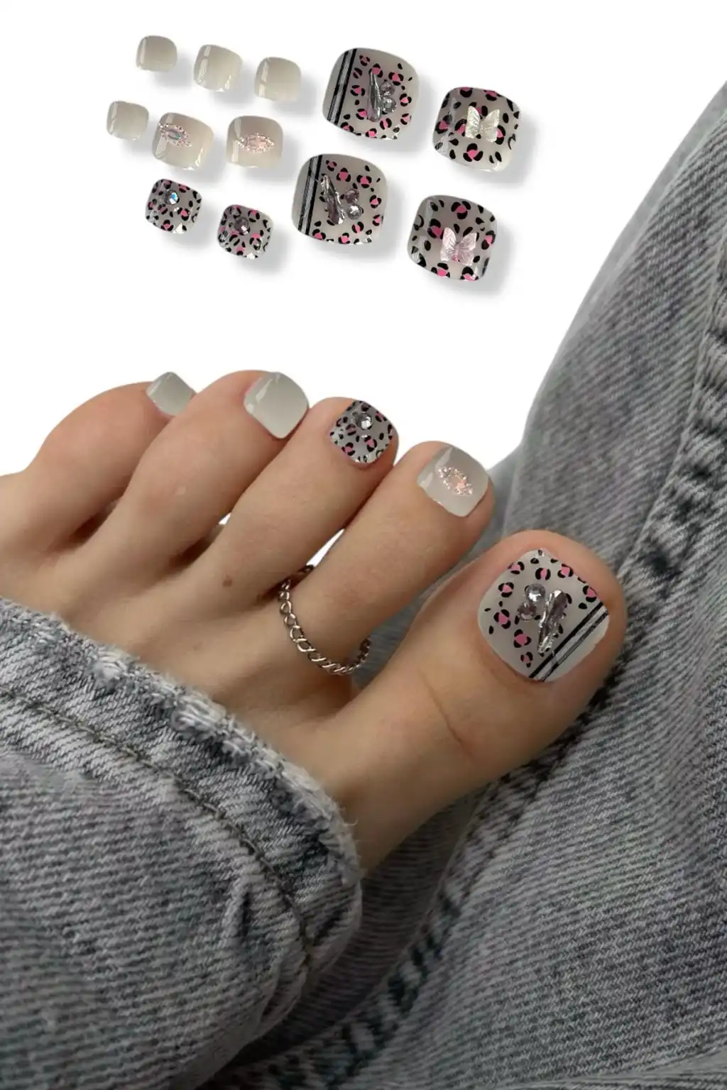 12'li Leopar Figürlü Kelebek Figürlü Taş Detaylı Ayak Takma Tırnak Set