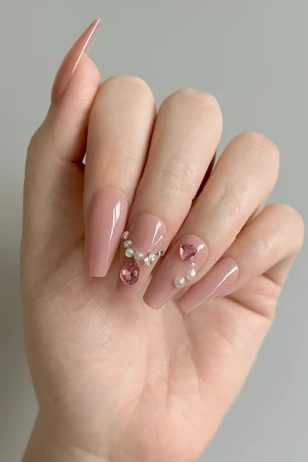 12'li Pembe Renk Taş Detaylı Takma Tırnak Set (Yapıştırıcılı)