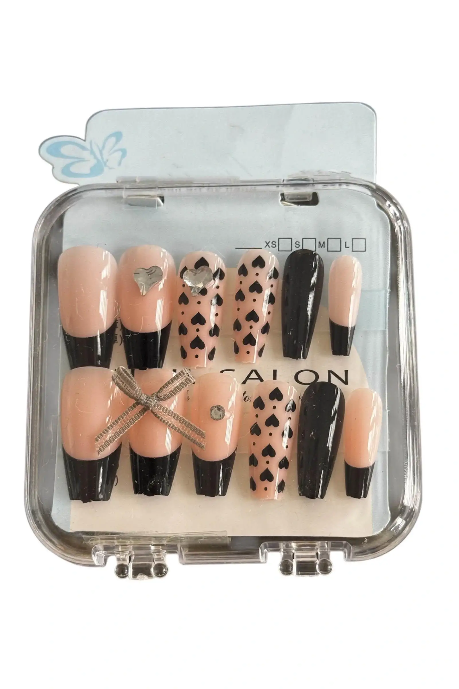 12'li Siyah Ve Pembe Renk Kurdele Figürlü Taşlı Takma Tırnak Set (Yapıştırıcılı)