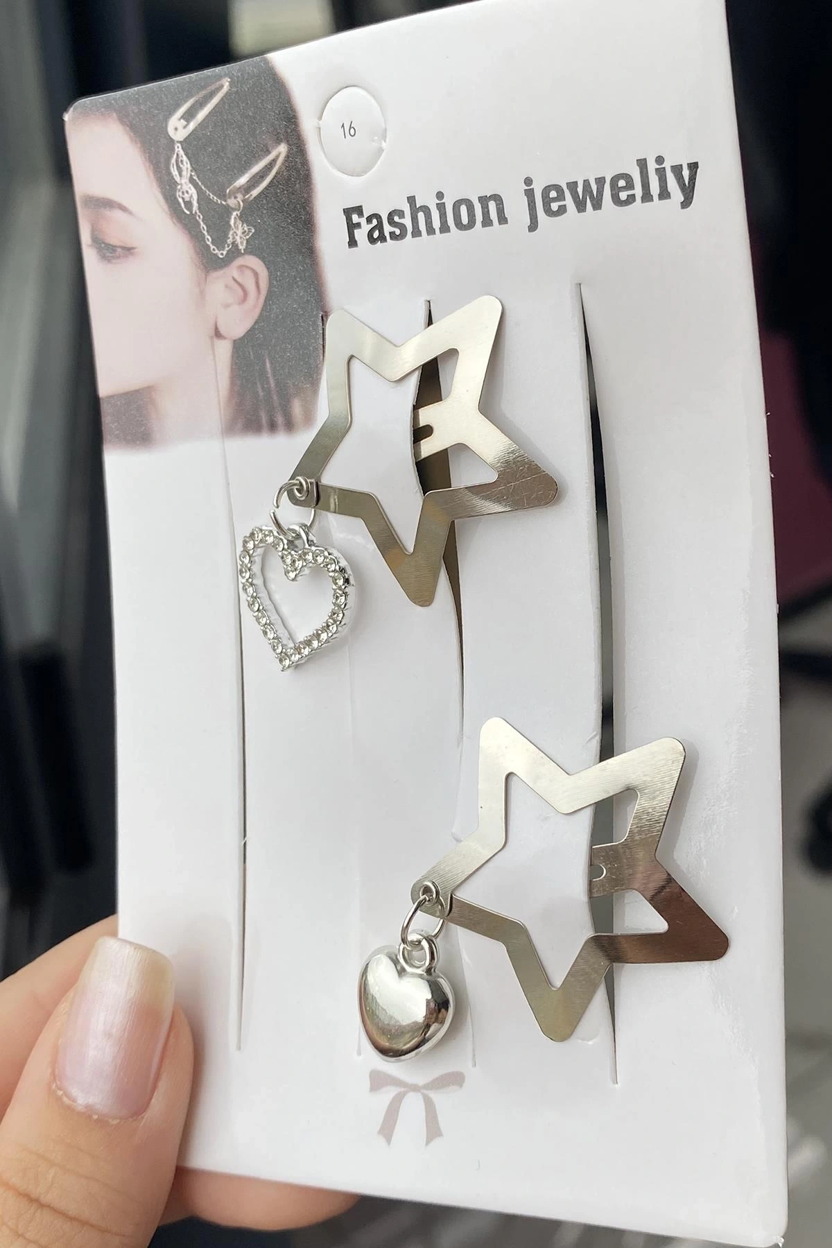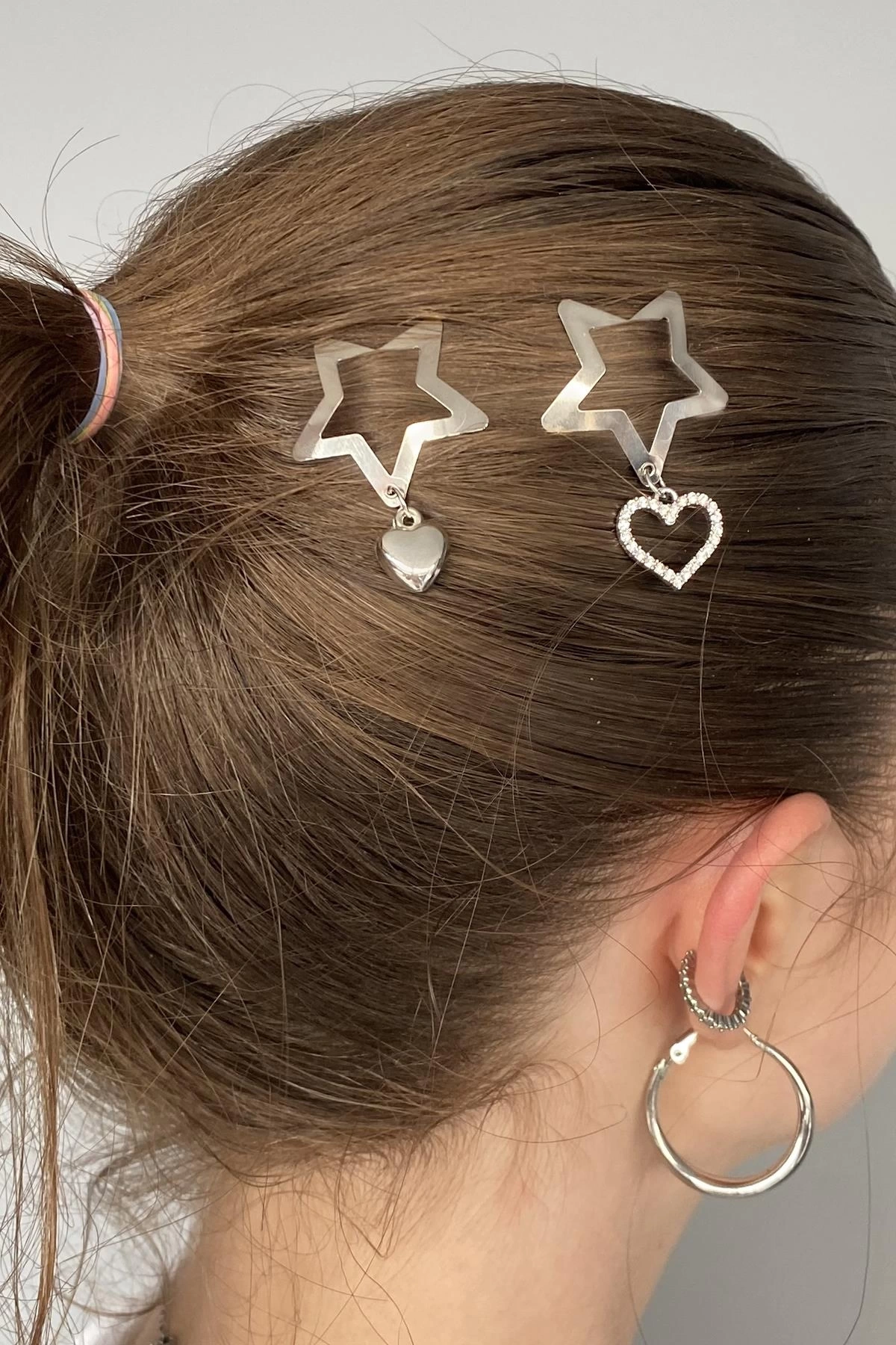 2'li Gümüş Renk Yıldız Figürlü Kalp Detaylı Yan Toka Set
