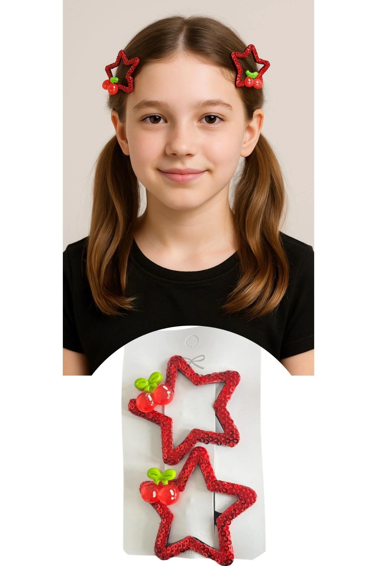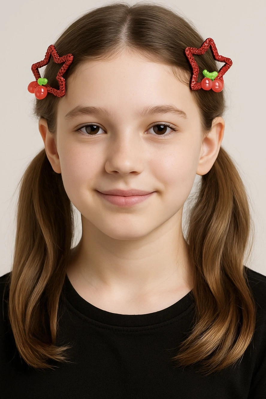 2'li Kırmızı Renk Yıldız Figürlü Kiraz Detaylı Yan Toka Set