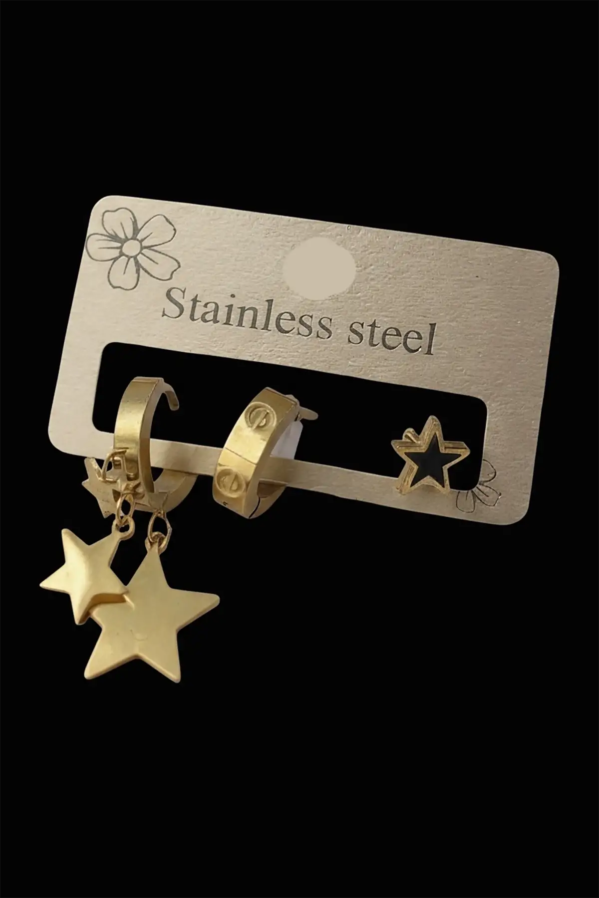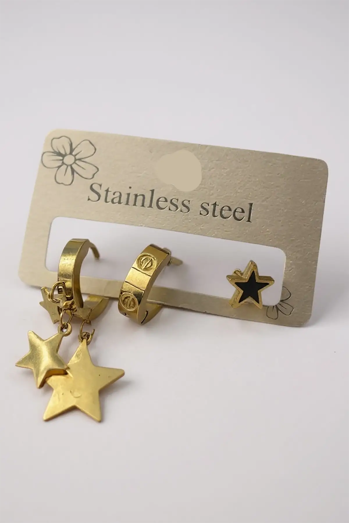 3'lü Altın Renk Karışık Figürlü Çelik Küpe Set
