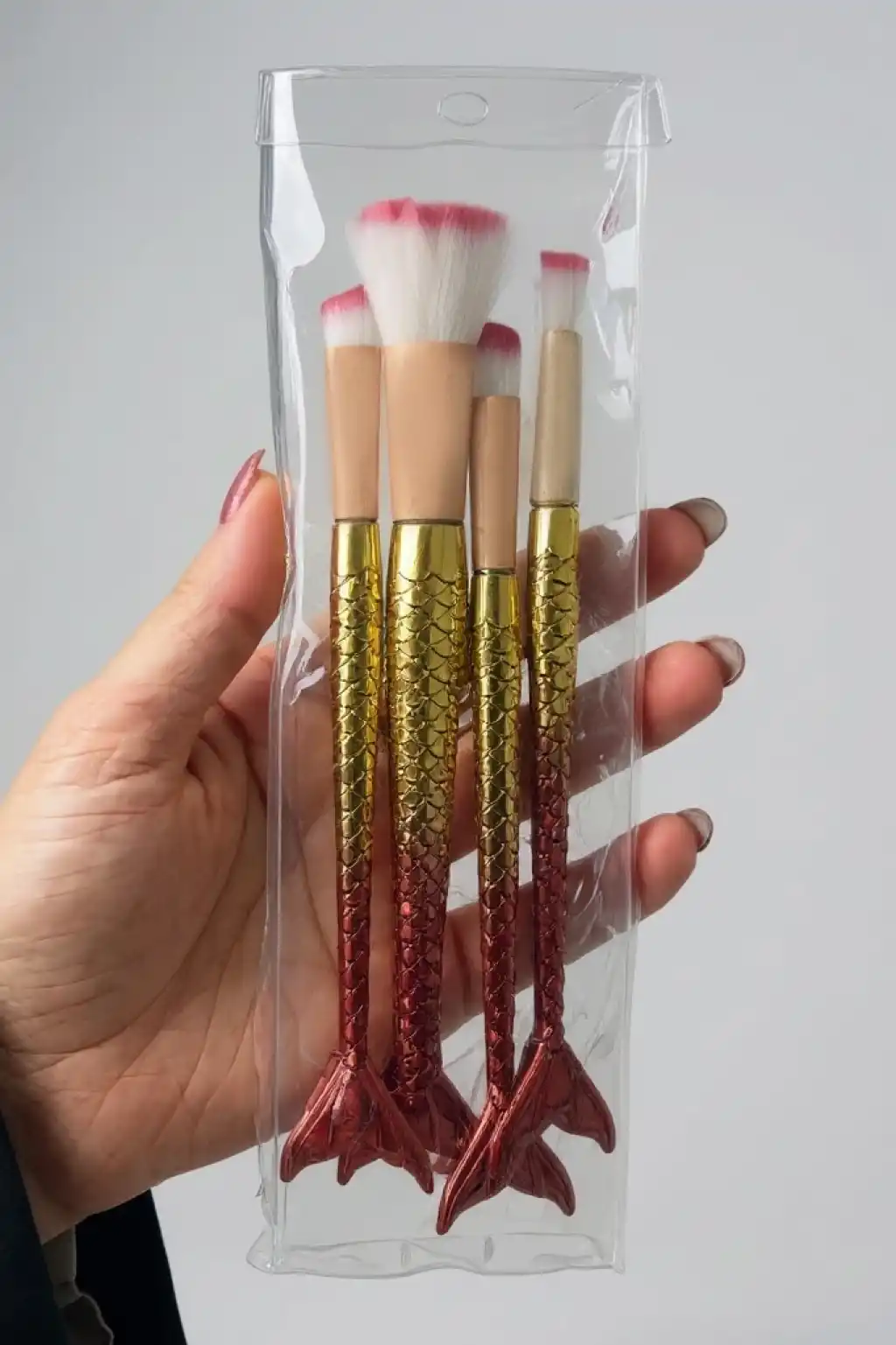 4'lü Kırmızı Ve Altın Renk Balık Kuyruğu Figürlü Makyaj Fırçası Set