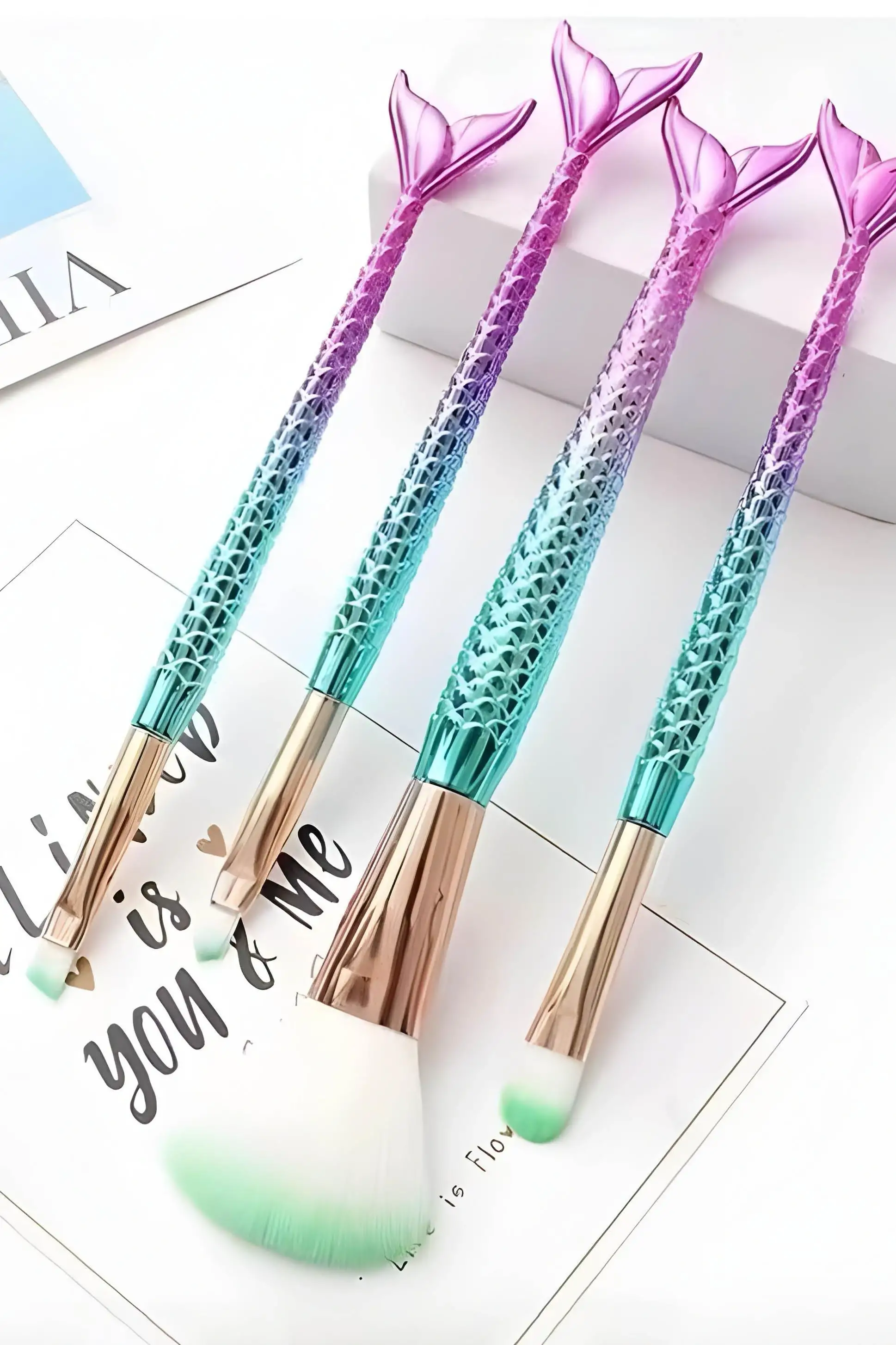 4'lü Pembe Ve Turkuaz Renk Balık Kuyruğu Figürlü Makyaj Fırçası Set