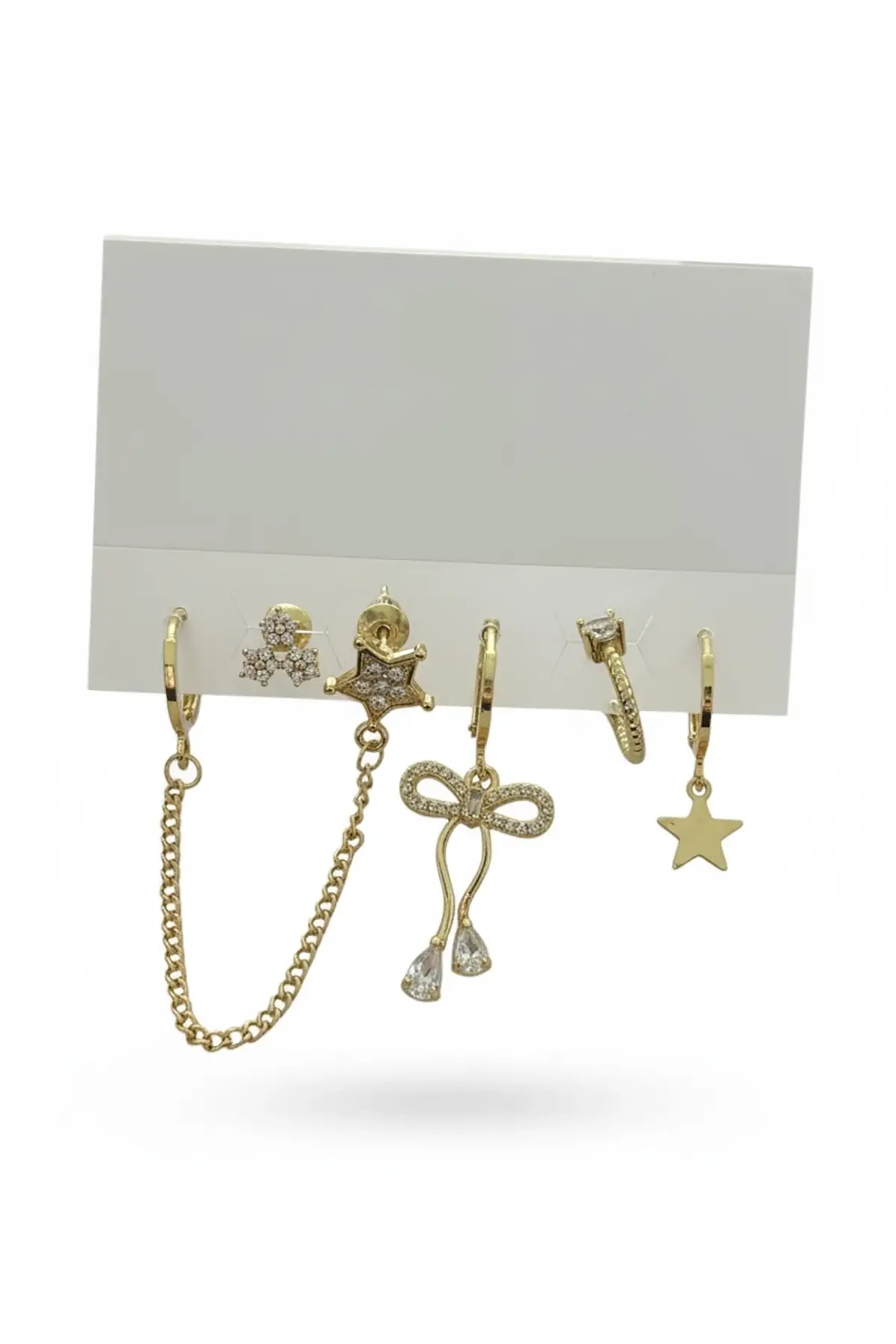 6'lı Altın Renk Kurdele Figürlü Taş Detaylı Küpe Set