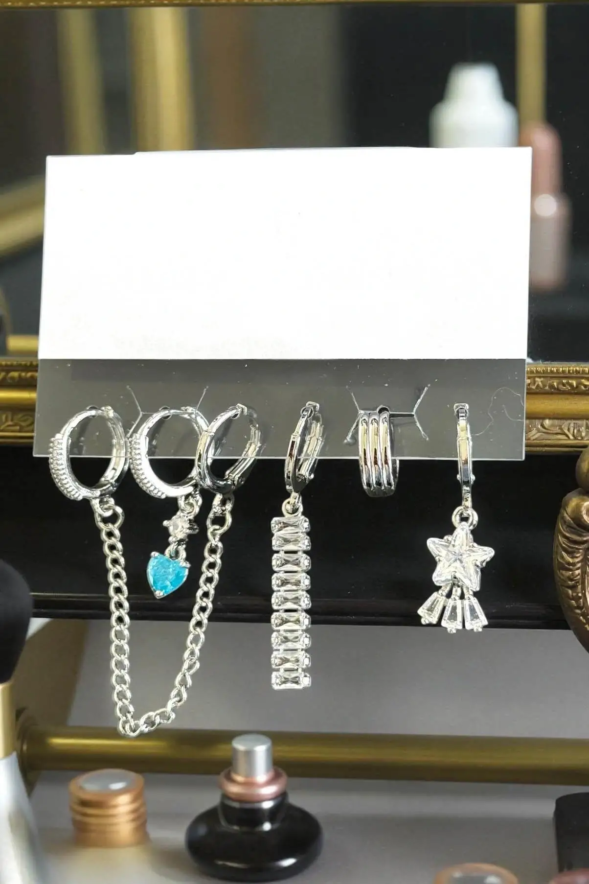 Gümüş Renk Taş Detaylı 6'lı Küpe Set