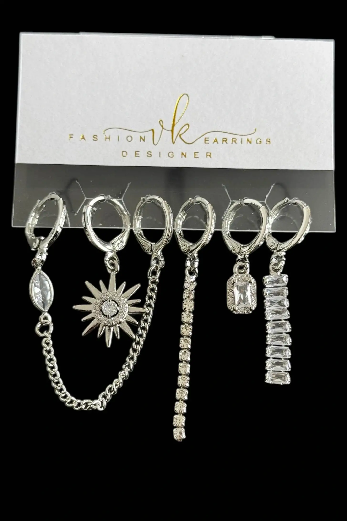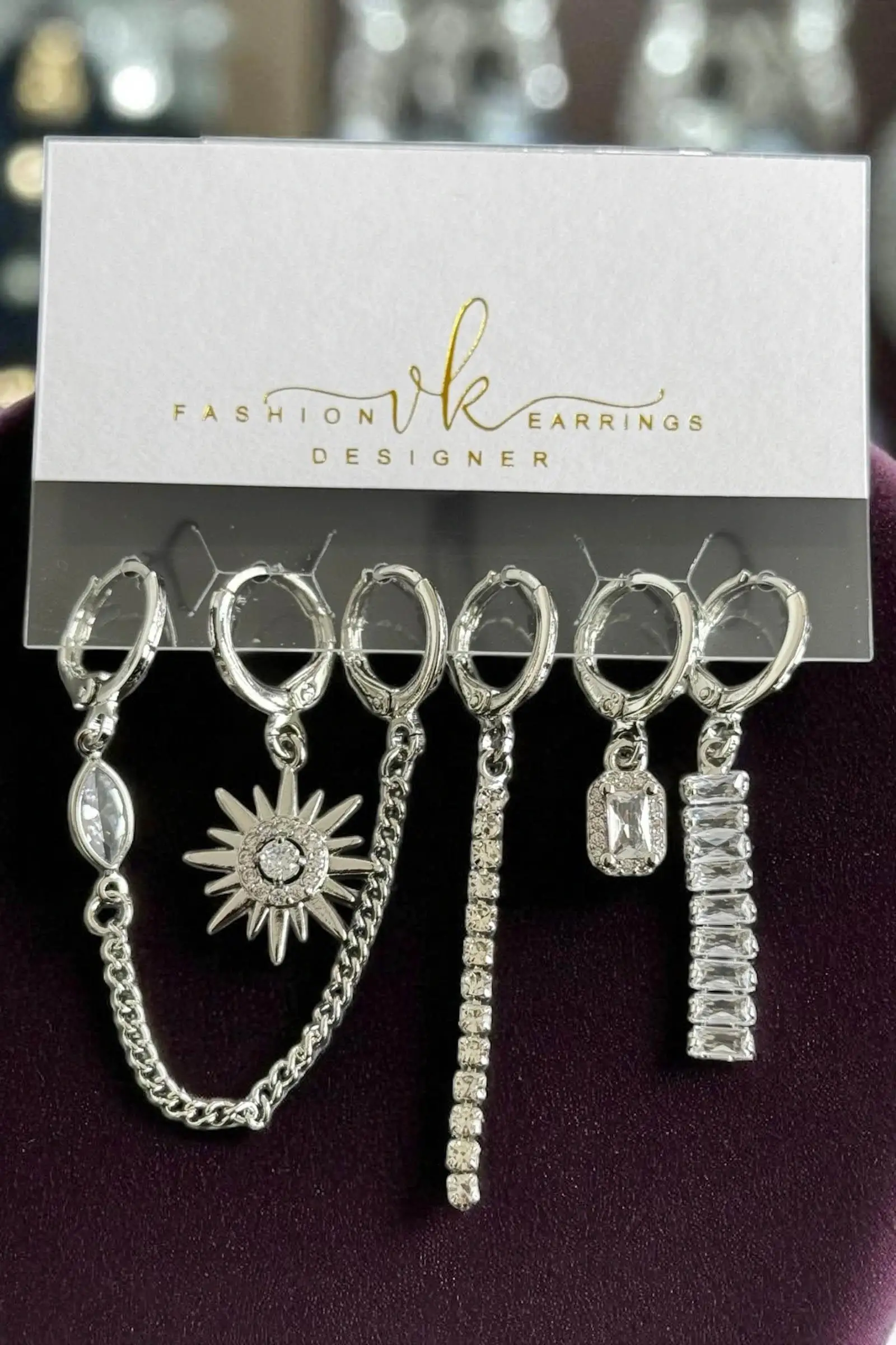 Gümüş Renk Taş Detaylı 6'lı Küpe Set