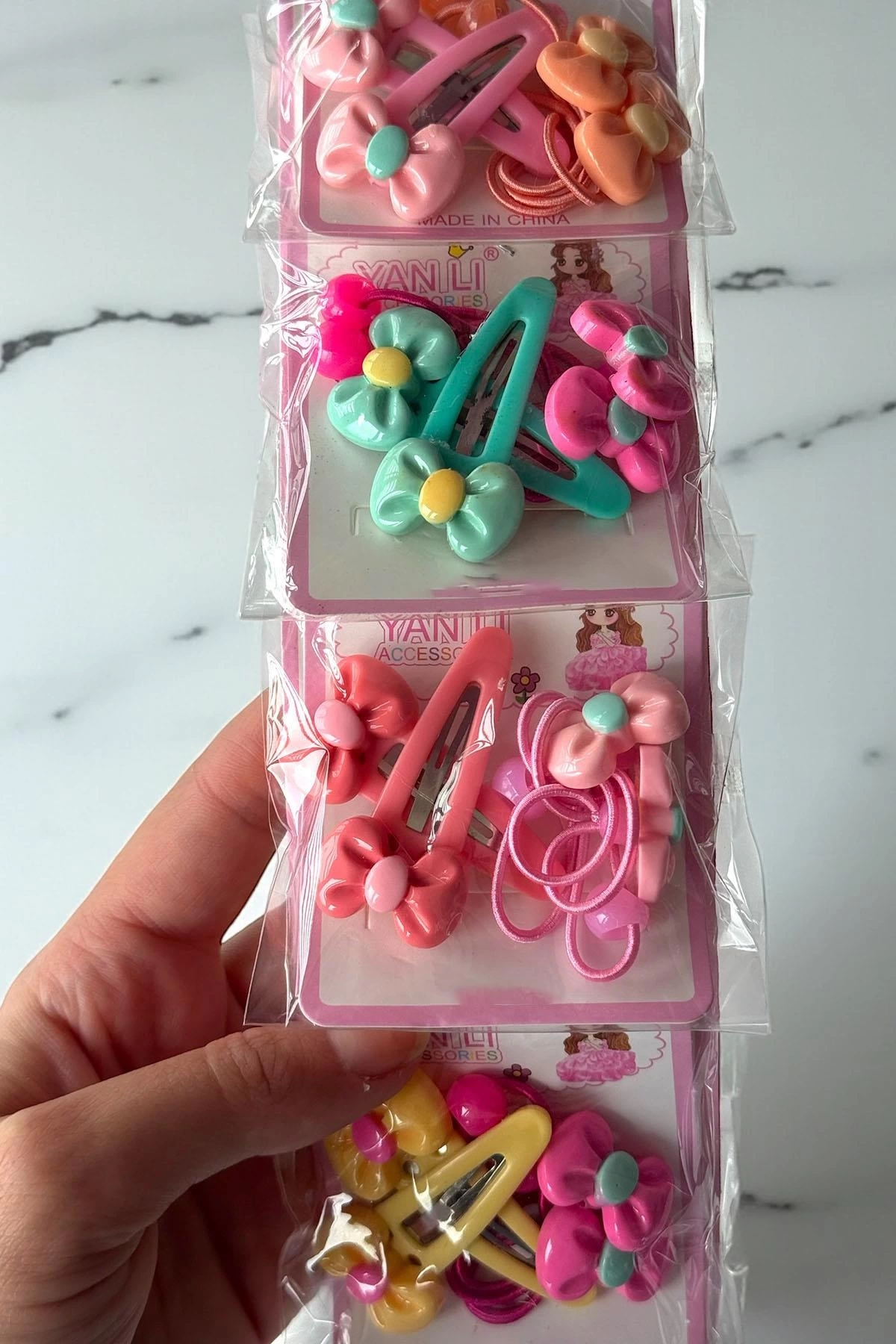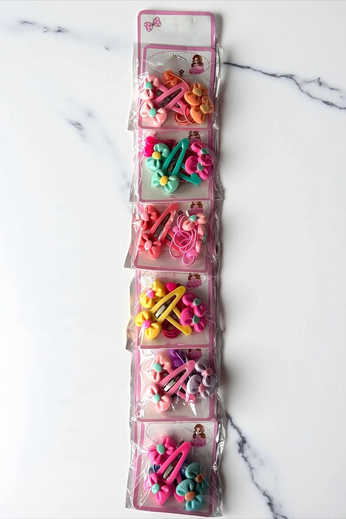 6'lı Karışık Renk Kurdele Figürlü Lastik Toka Ve Yan Toka Set