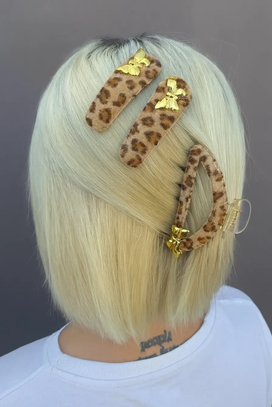 Açık Kahve Renk Kelebek Figürlü Leopar Desenli Mandal Toka Ve Yan Toka Set