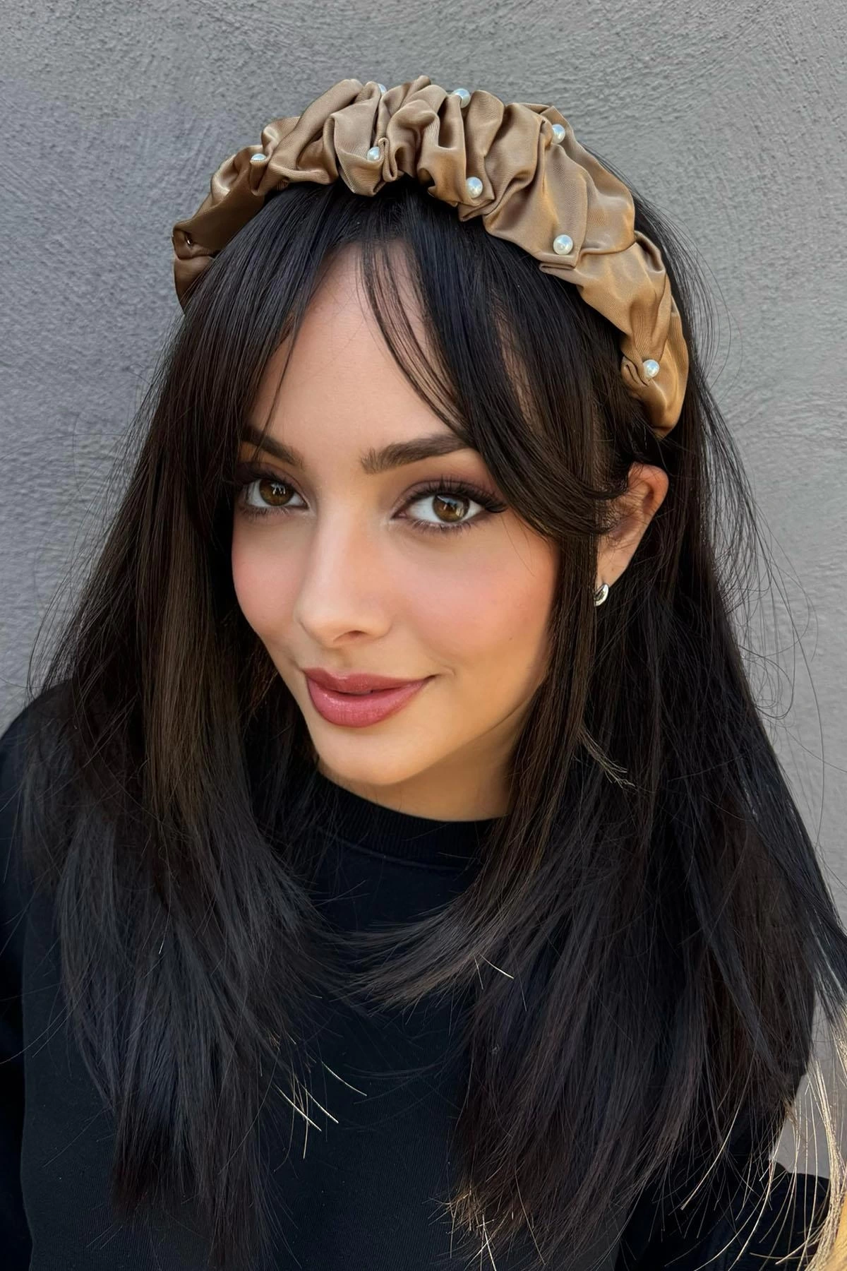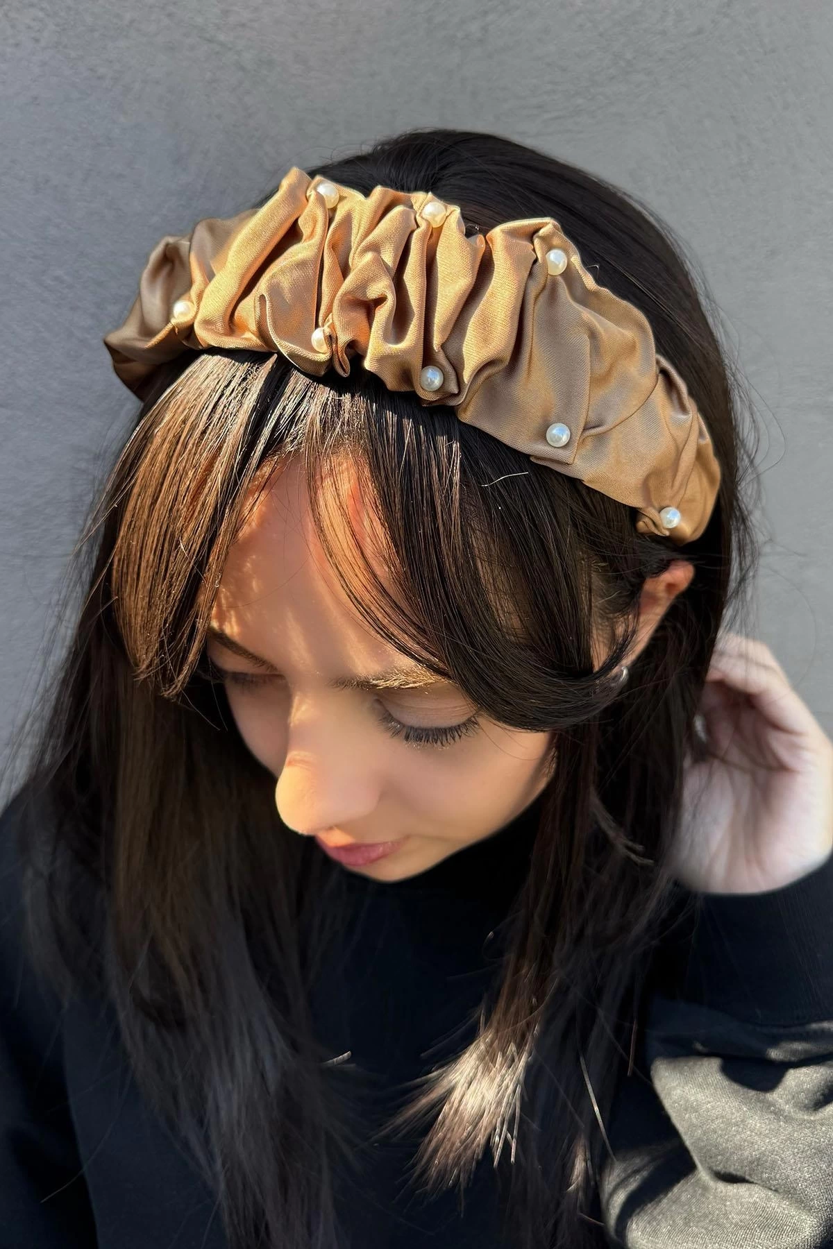Açık Kahverengi İnci Detaylı Büzgülü Taç