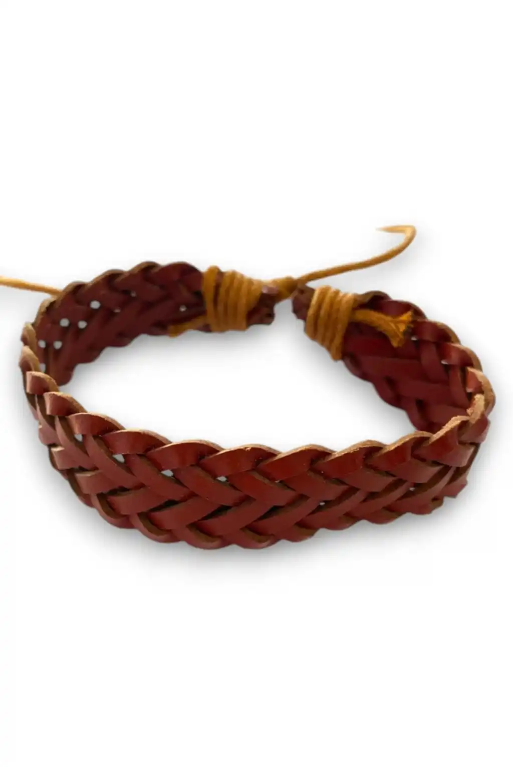 Açık Kahverengi Örgü Figürlü Deri Erkek Bileklik
