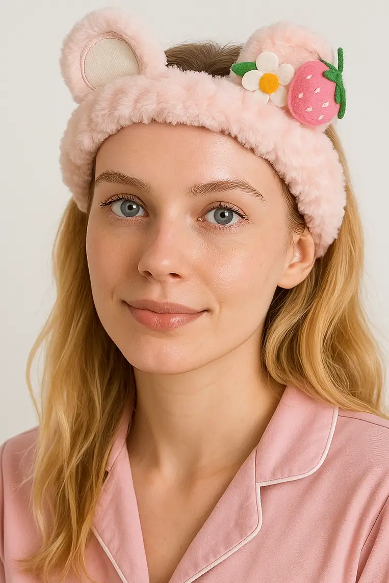 Fuşya Renk Çilek Ve Çiçek Figürlü Kulak Detaylı Peluş Saç Bandı