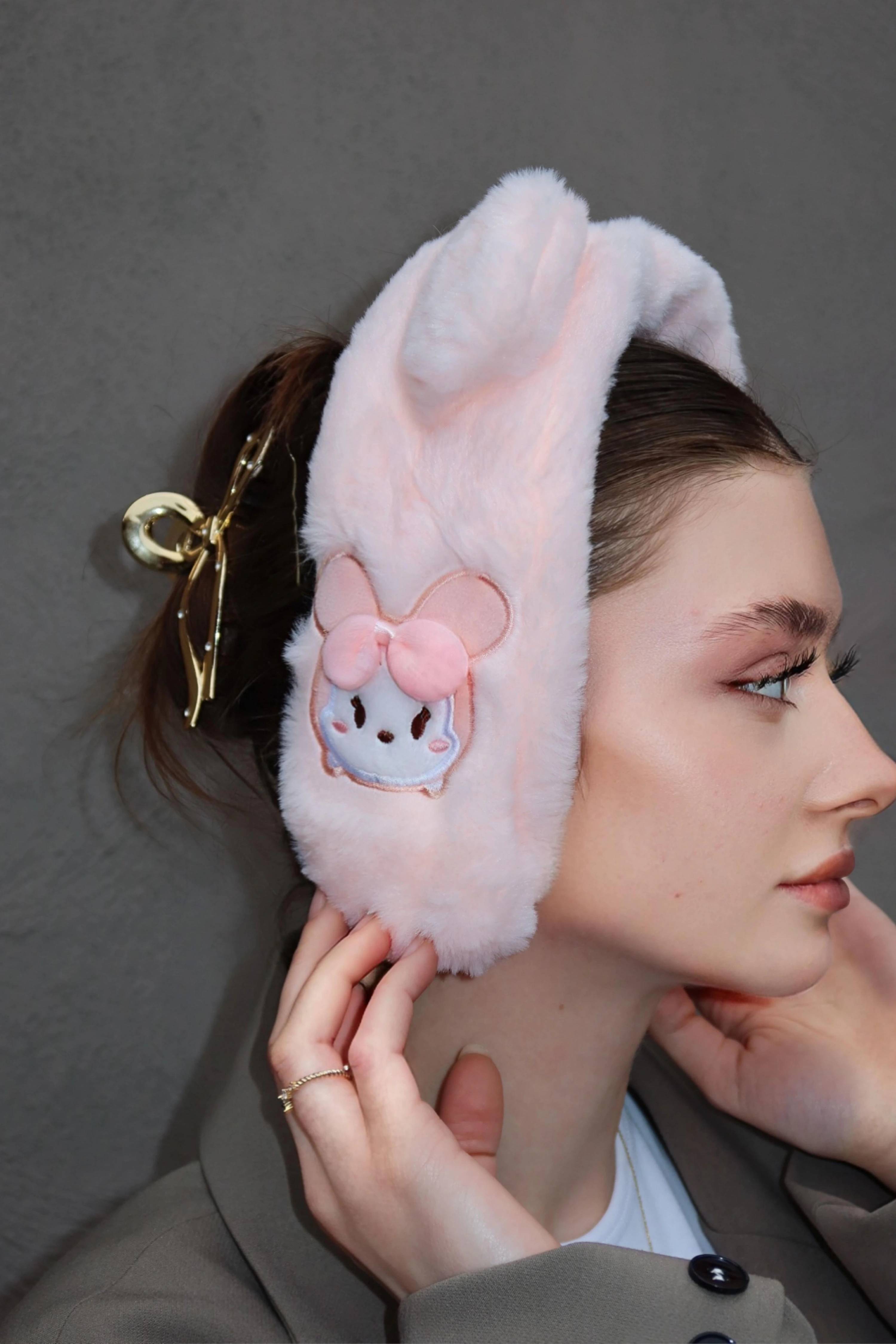 Açık Pembe Renk Tavşan Figürlü Peluş Çocuk Kulaklık