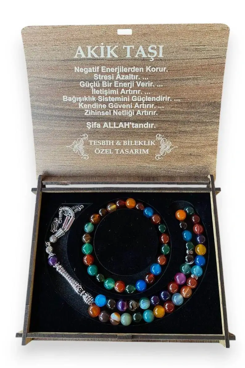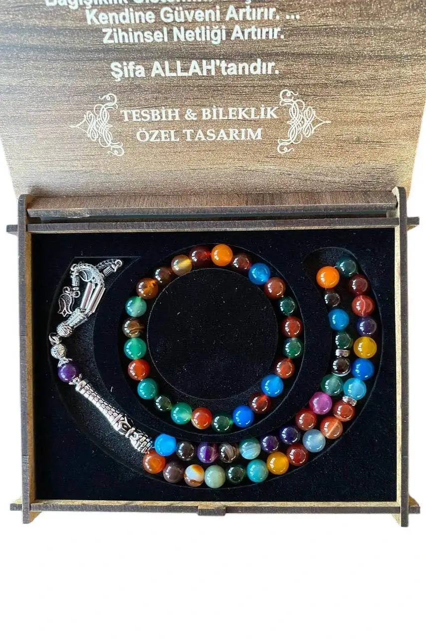 Aynı taş dizilimine sahip tesbih ve bileklik, uyumlu ve bütünlüklü bir stil sunar.
