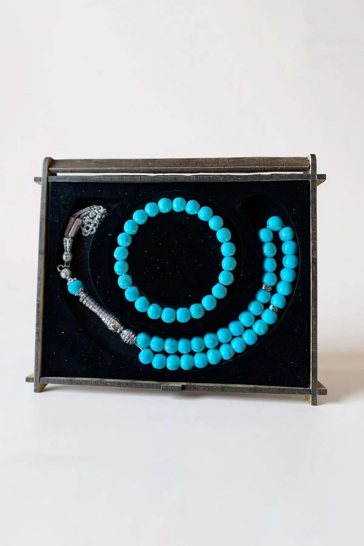 Aynı taş dizilimine sahip tesbih ve bileklik, uyumlu ve bütünlüklü bir stil sunar.