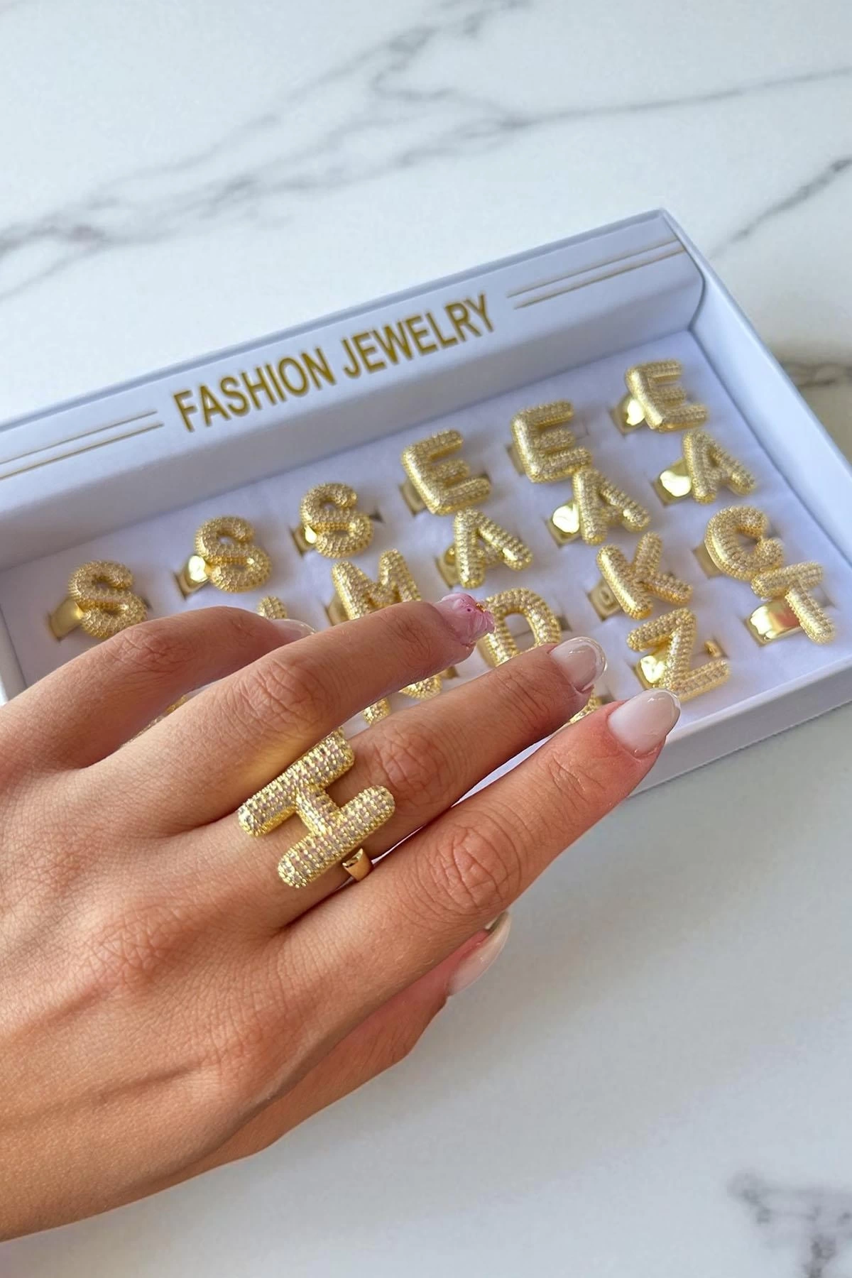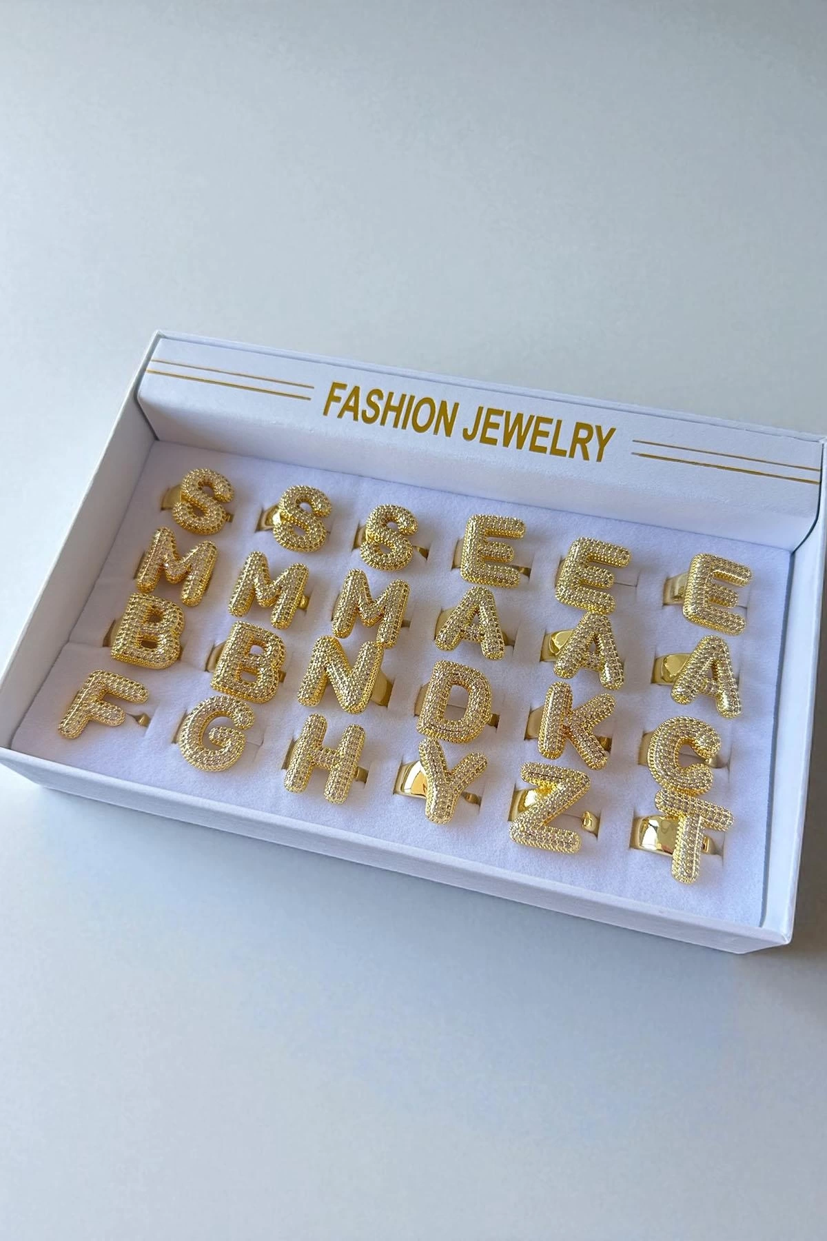 Altın Renk 24'lü Taş Detaylı Harf Yüzük Set