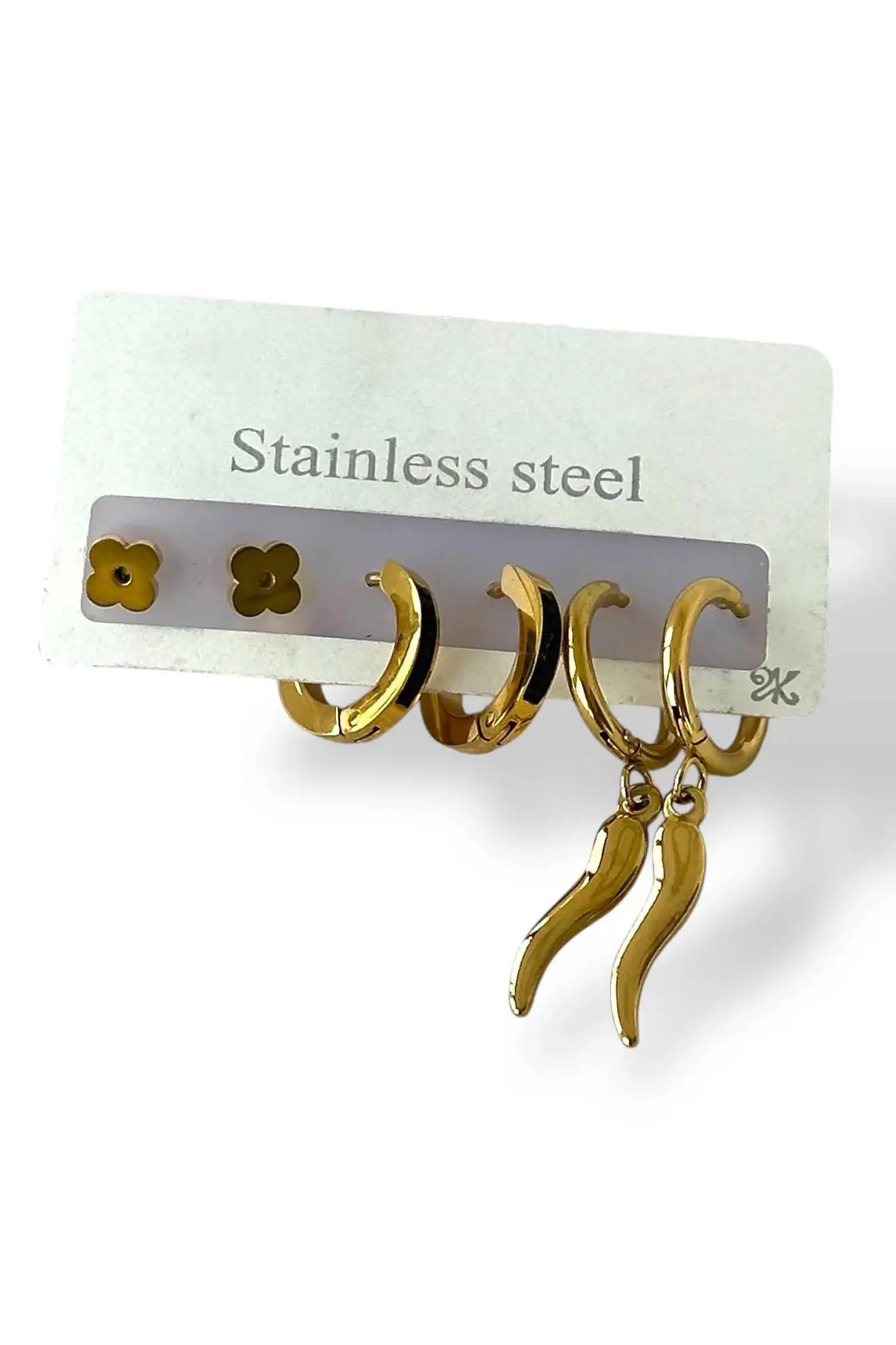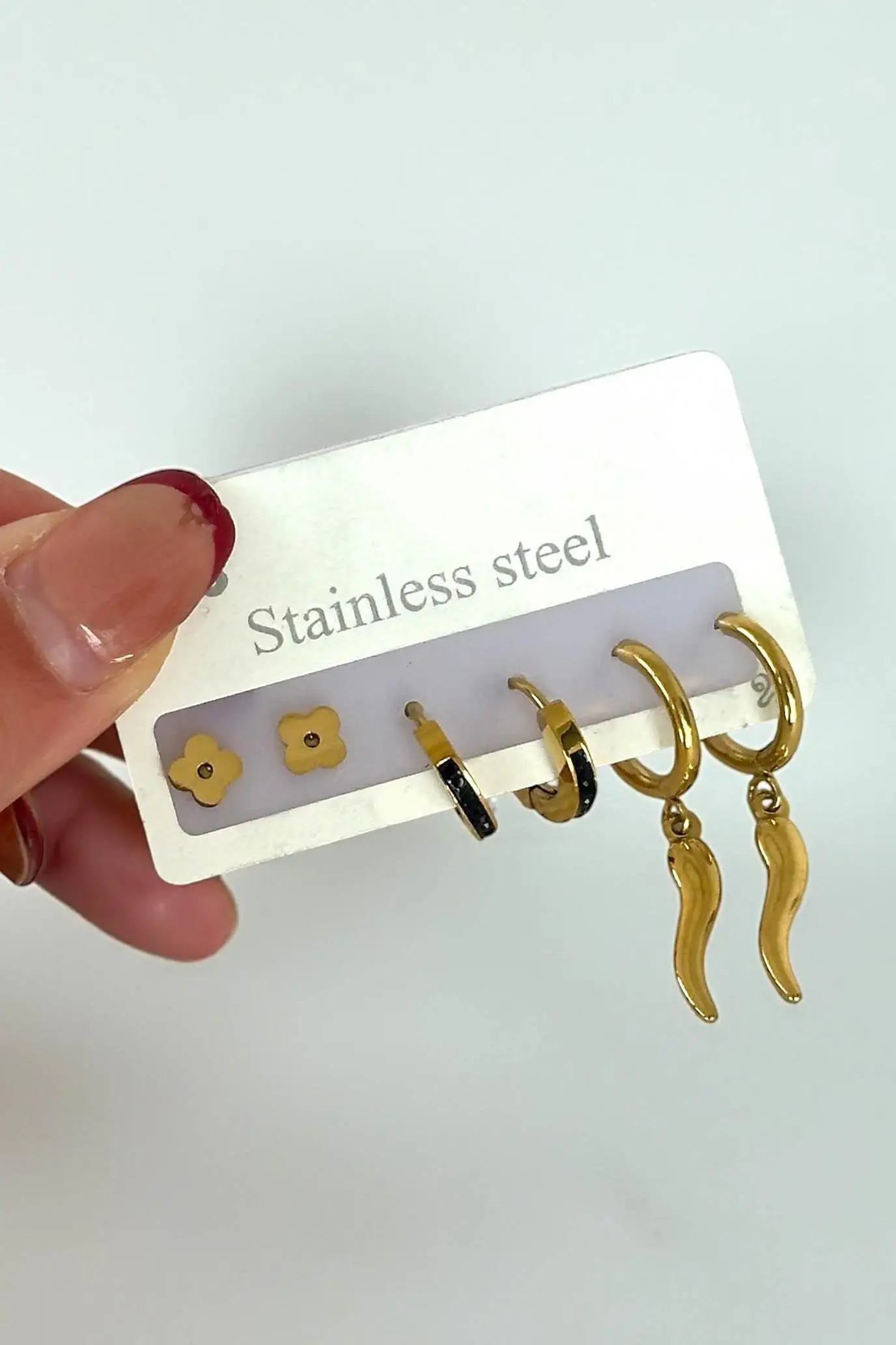Altın Renk Taş Detaylı 6'lı Çelik Küpe Set