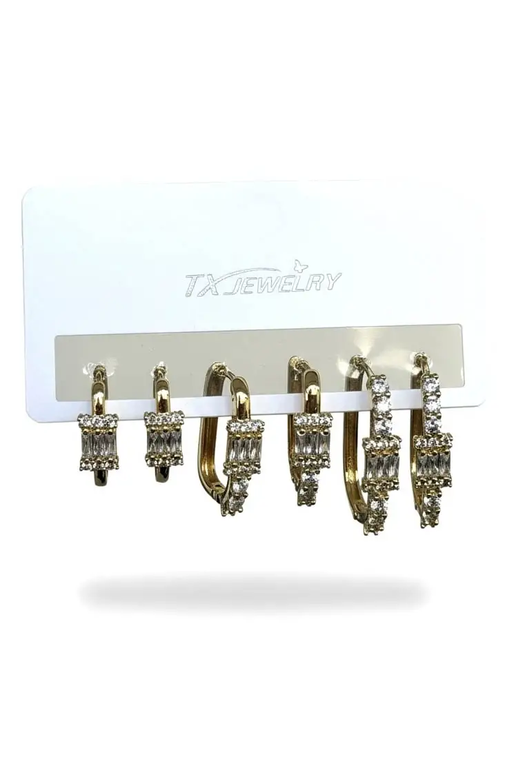 Altın Renk 6'lı Taş Detaylı TX 14K Altın Kaplama Küpe Set