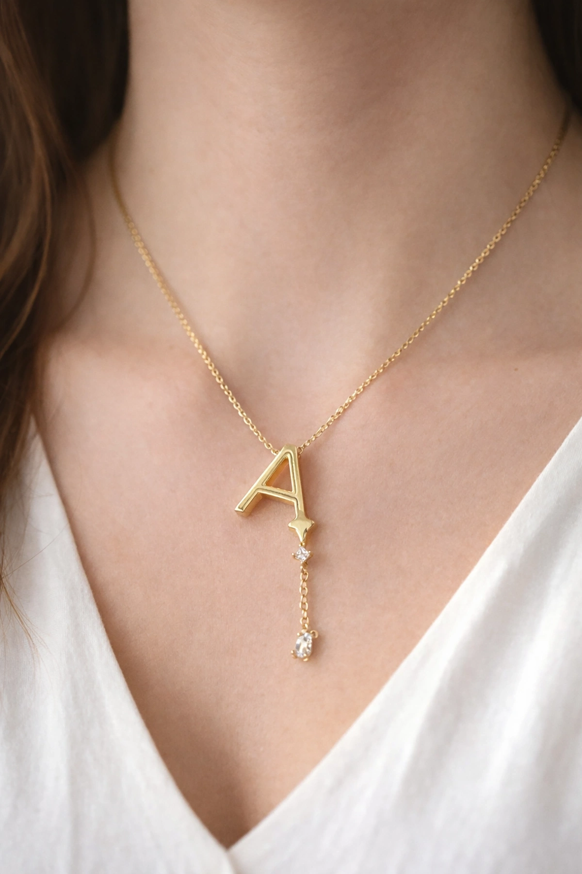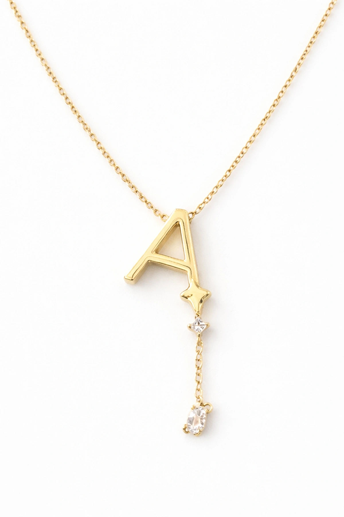 Altın Renk A Harfli Taş Detaylı Çelik Kolye