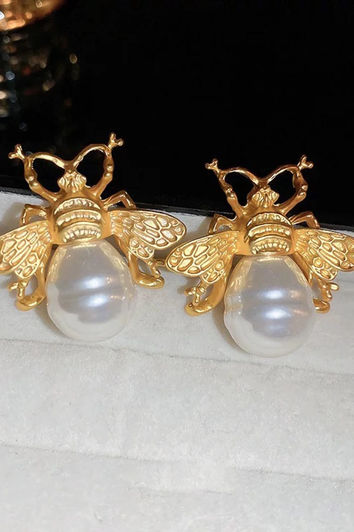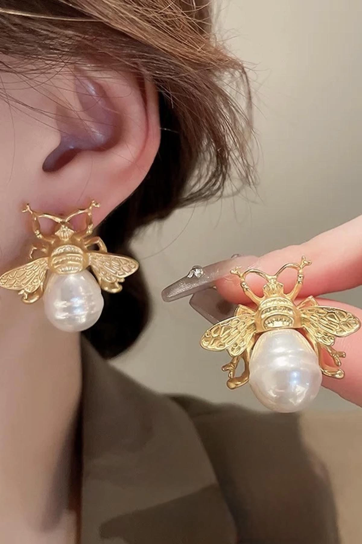 Altın Renk Arı Figürlü İnci Detaylı Çelik Küpe (Çift)