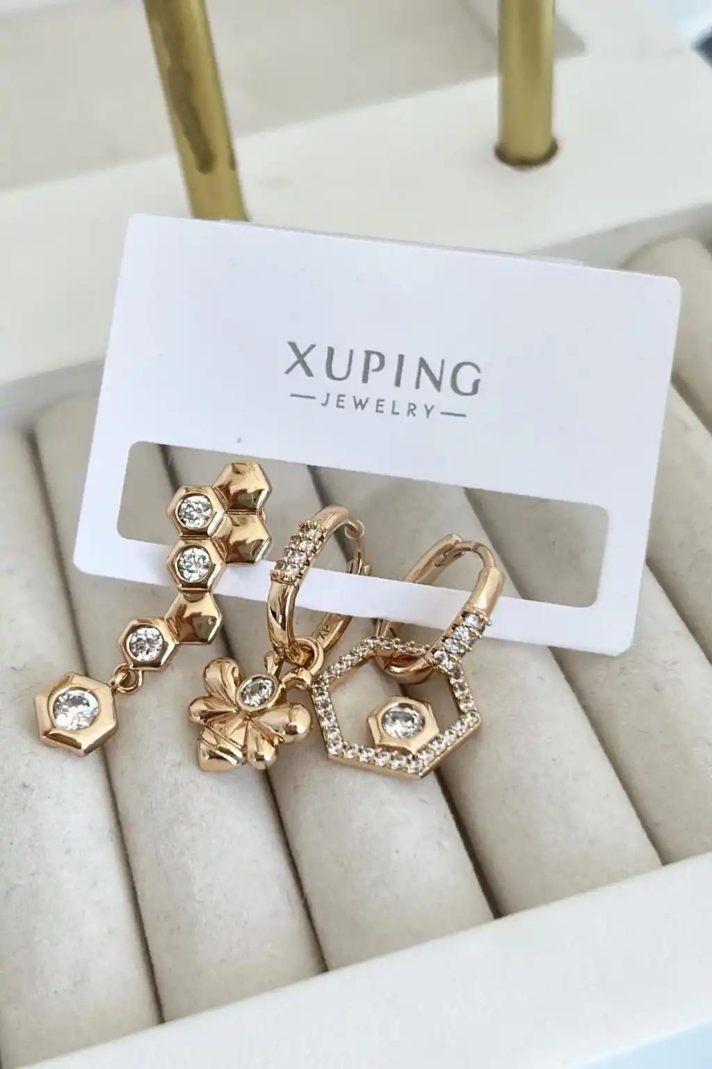 Altın Renk Taş Detaylı Çelik 3'lü Xuping Küpe