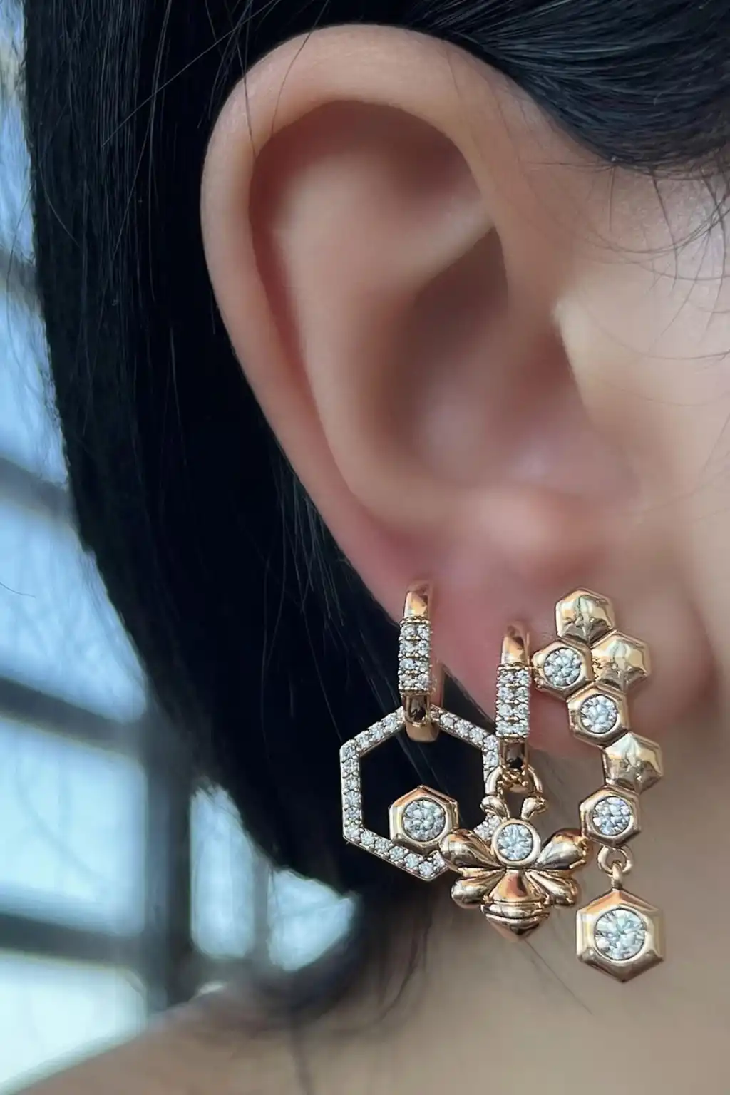 Altın Renk Arı Figürlü Taş Detaylı Çelik Xupıng 3'lü Küpe Set (Çift)