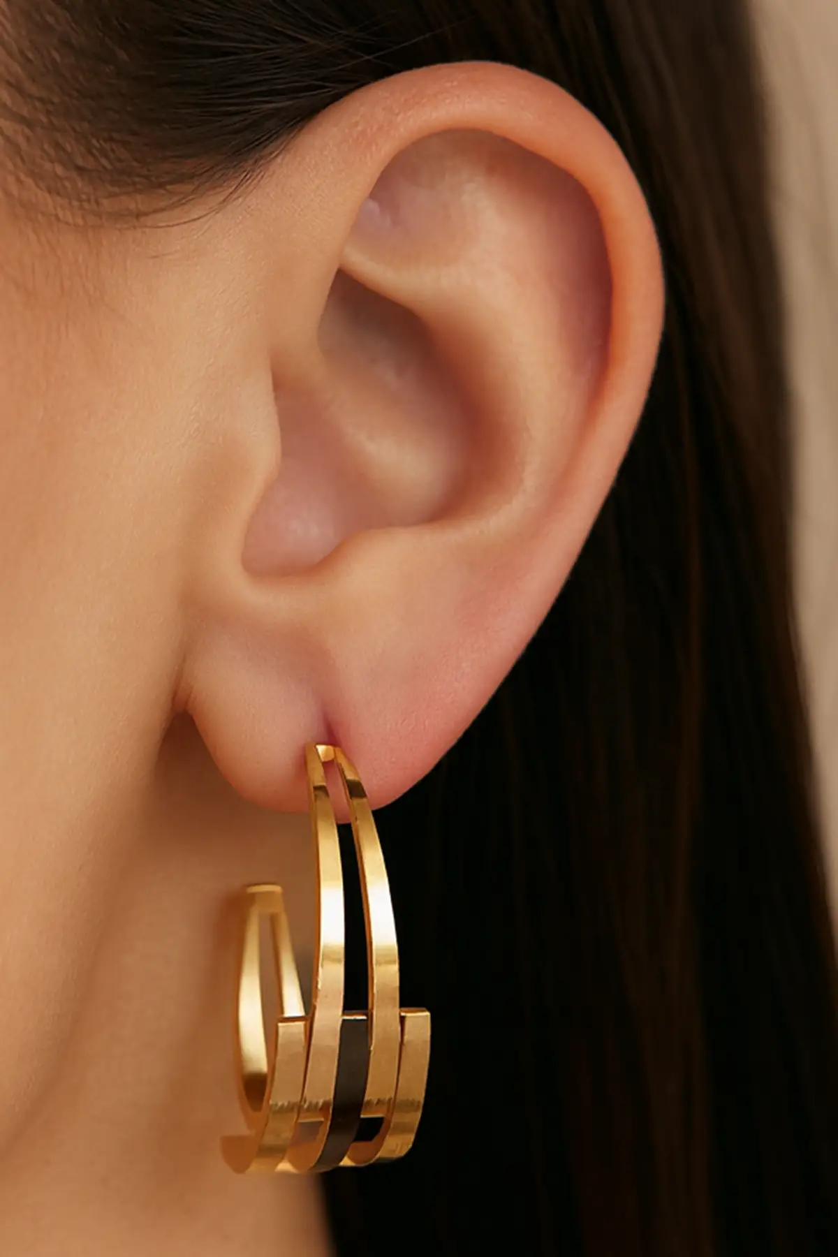 - Zarif tasarımıyla dikkat çeken bu çift küpe, altın rengi detaylarıyla göz alıcı bir görünüm sunar.
