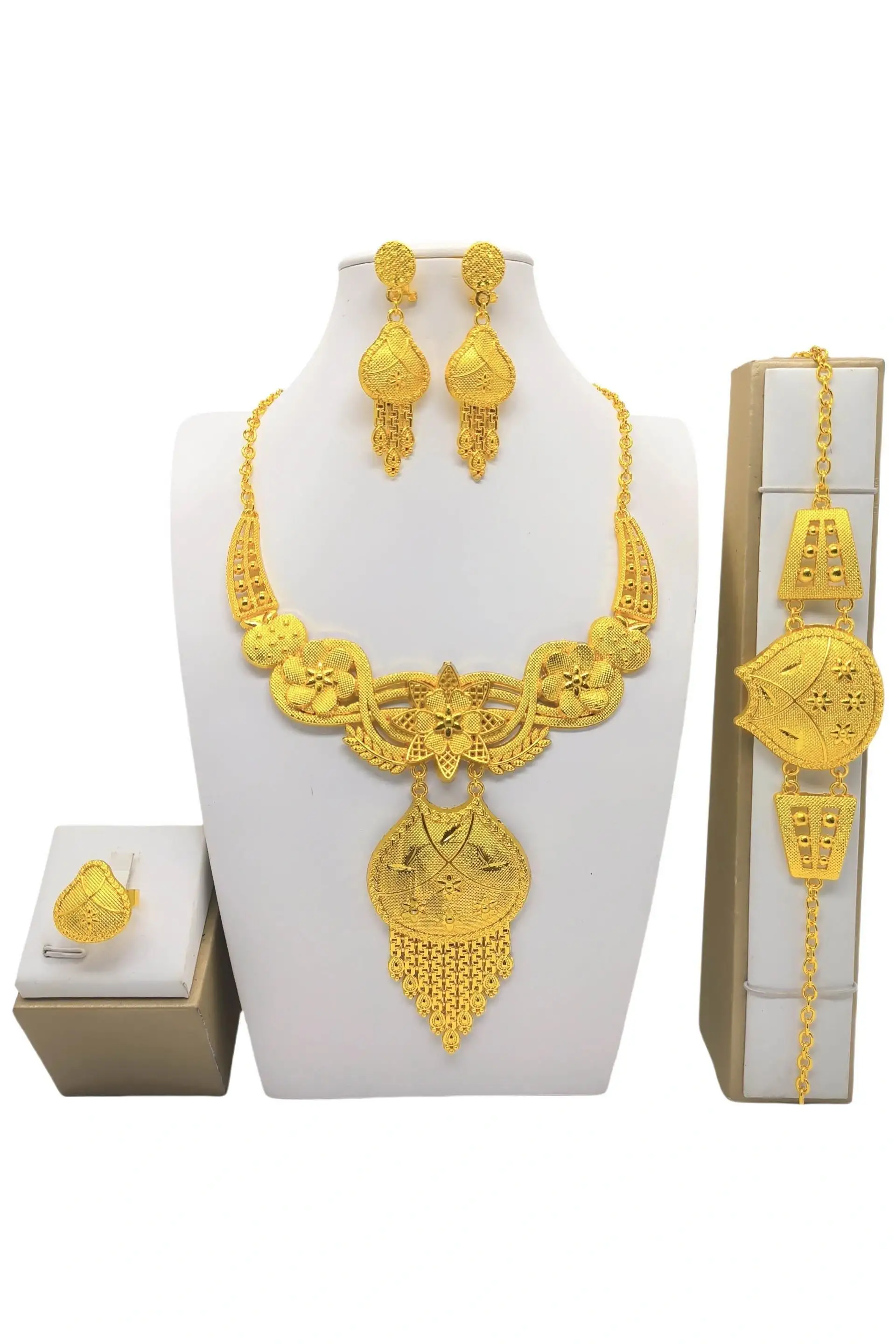 Altın Renk Çelik Kolye, Küpe, Bileklik, Yüzük Düğün Kına Nişan Gelin Seti