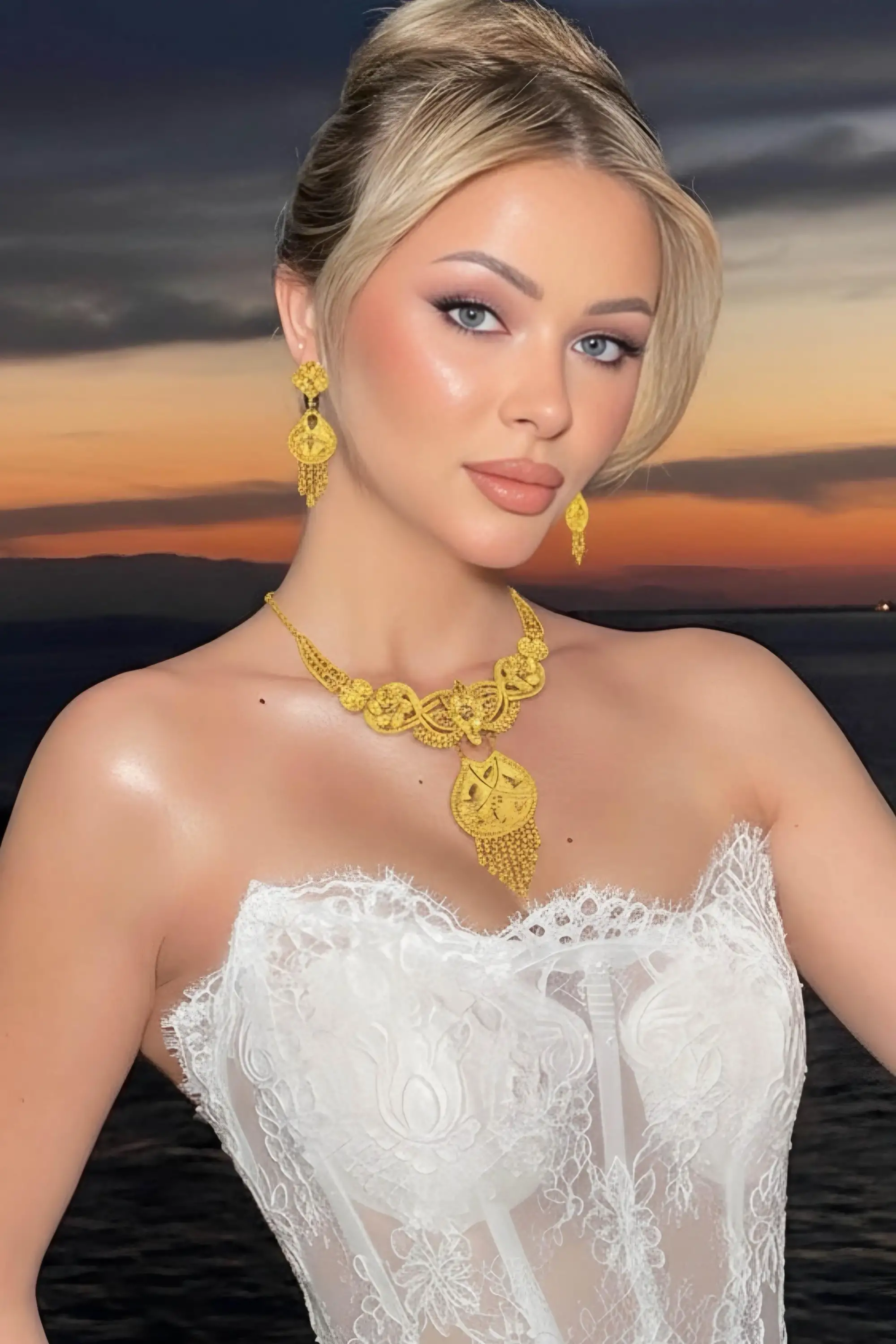 Altın Renk Kolye Ve Küpe Düğün Kına Nişan Gelin Seti