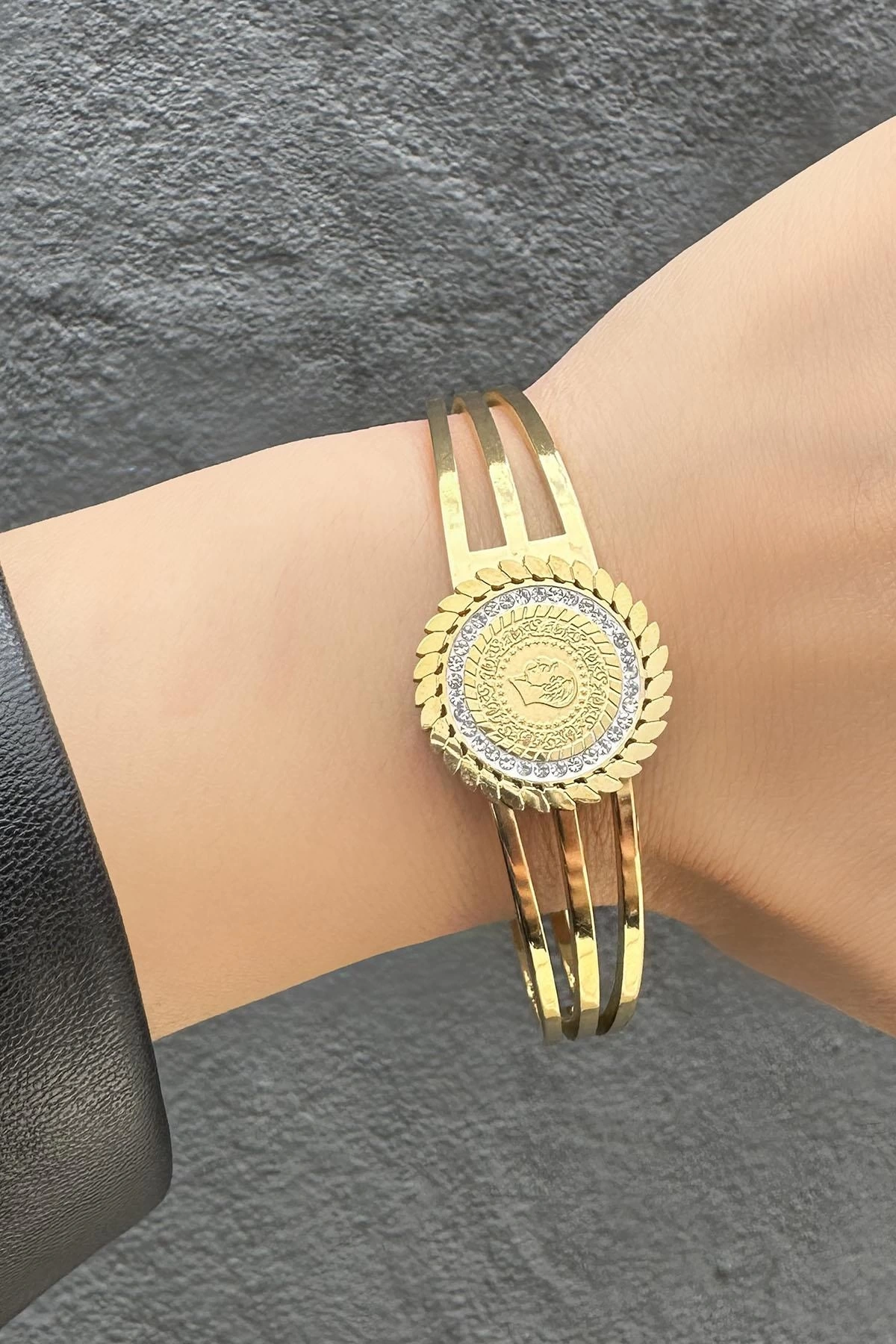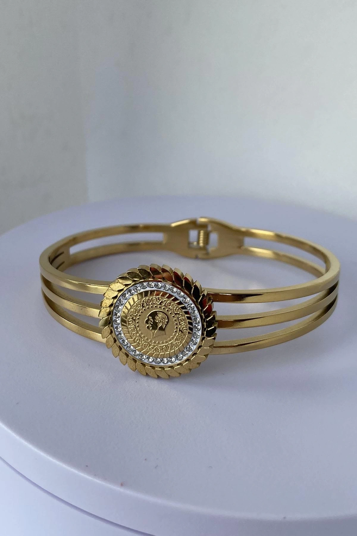 Altın Renk Çeyrek Figürlü Çelik Kelepçe Bileklik