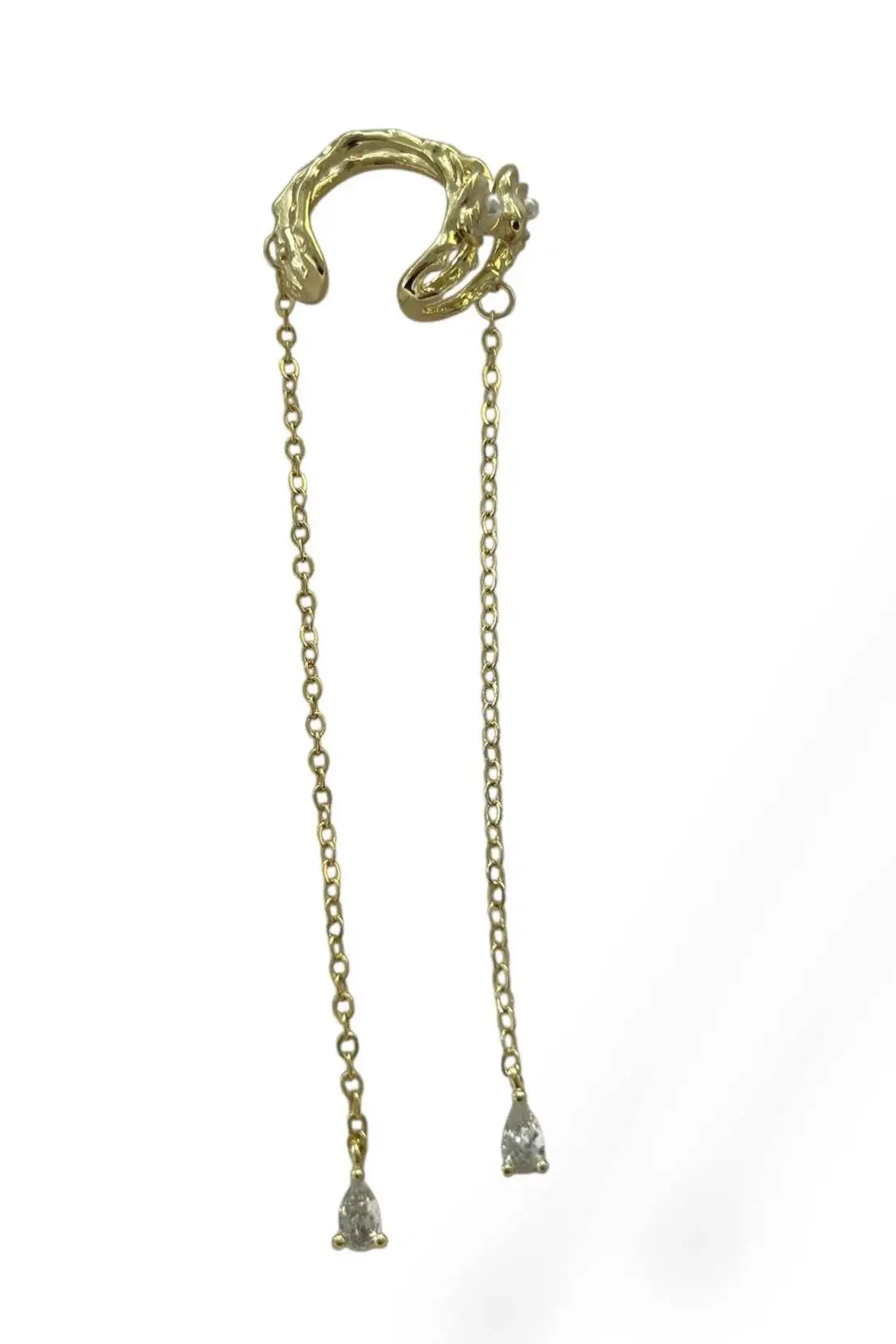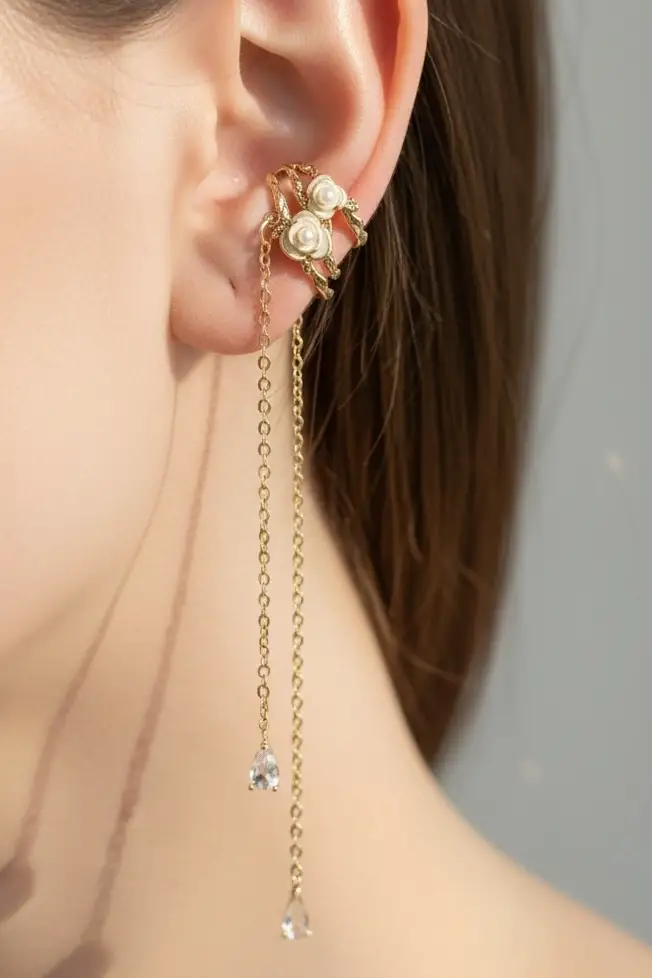 - Zarif tasarımıyla dikkat çeken bu kulak aksesuarı, altın rengi detaylarıyla göz alıcı bir görünüm sunar.