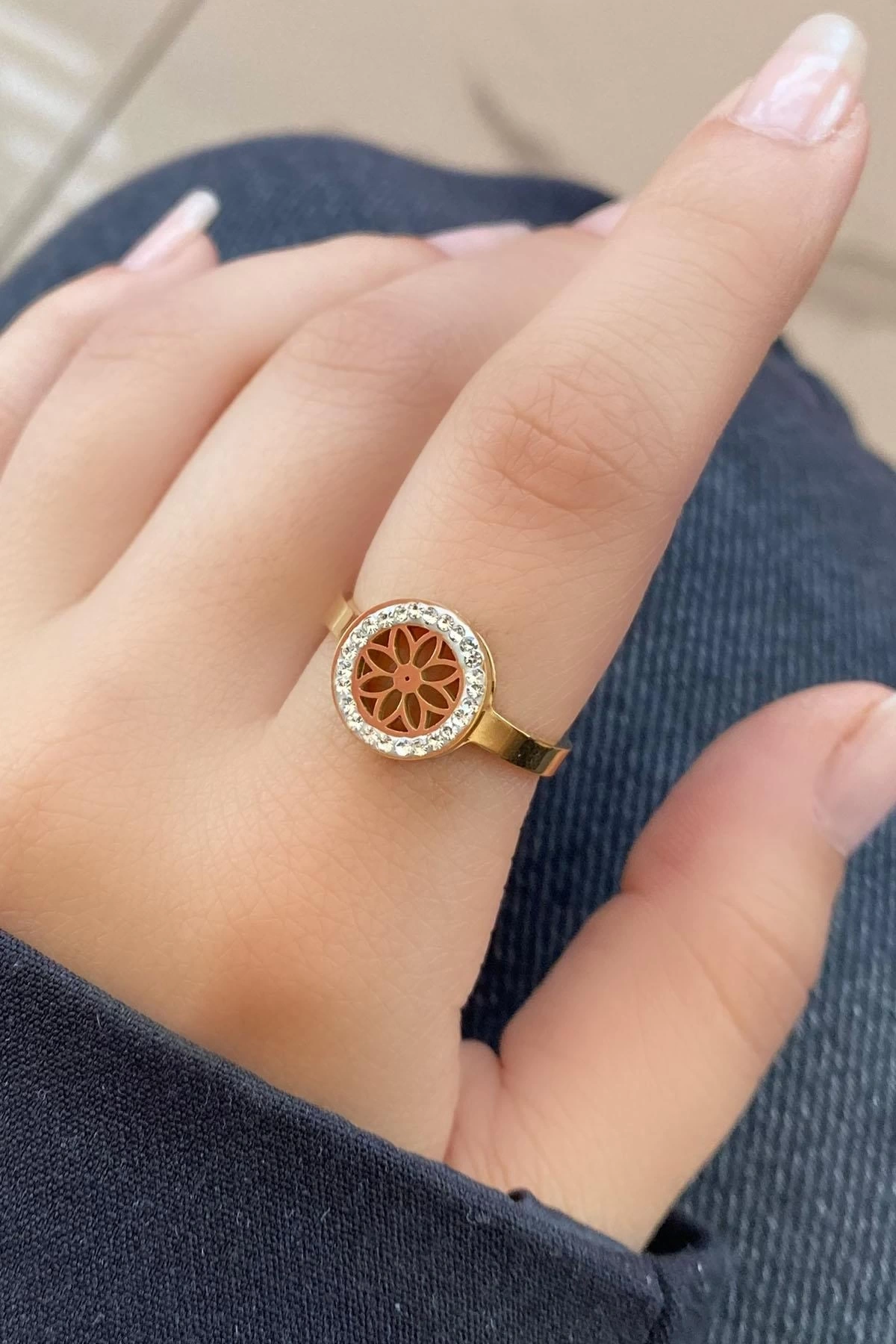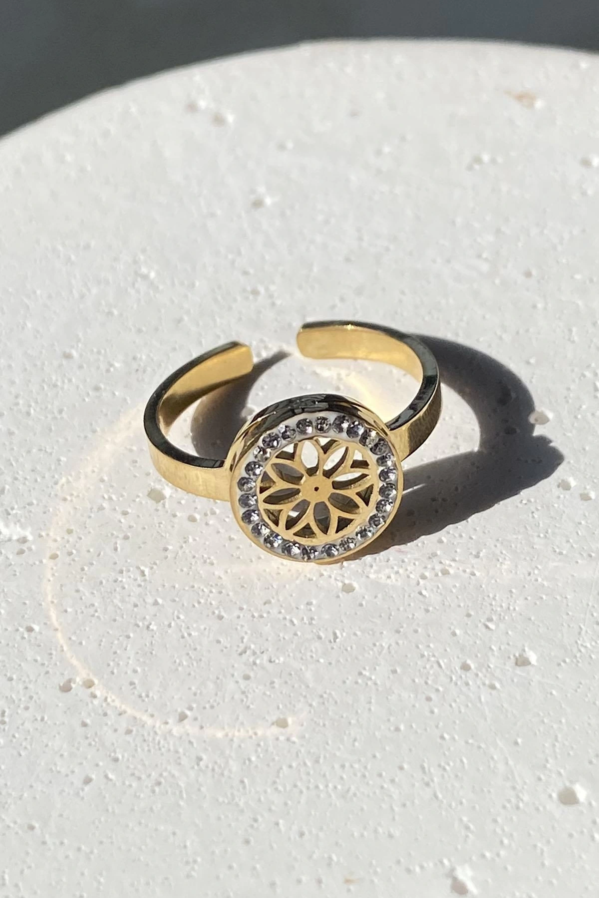 Altın Renk Çiçek Figürlü Ayarlanabilir Çelik Yüzük