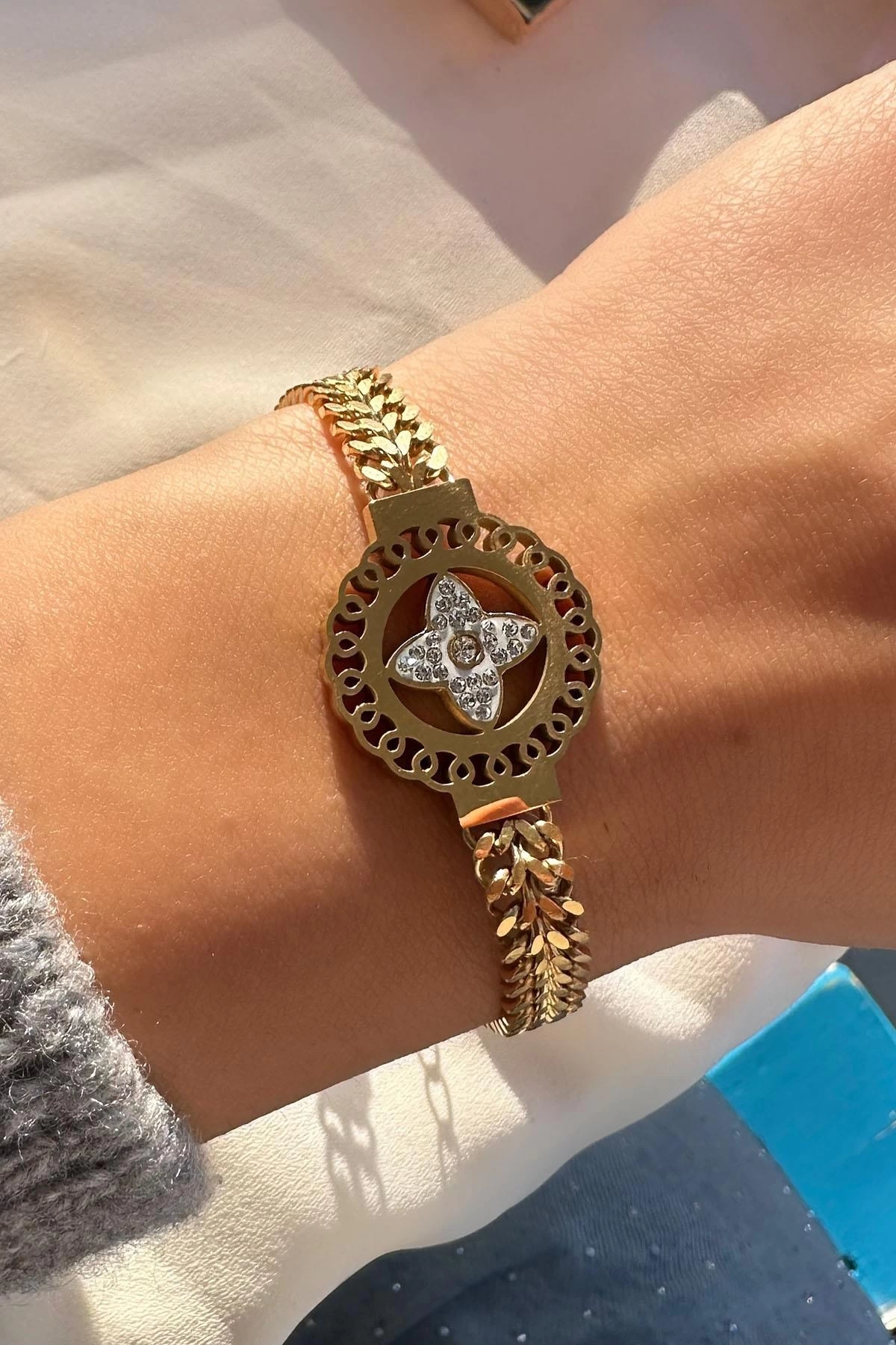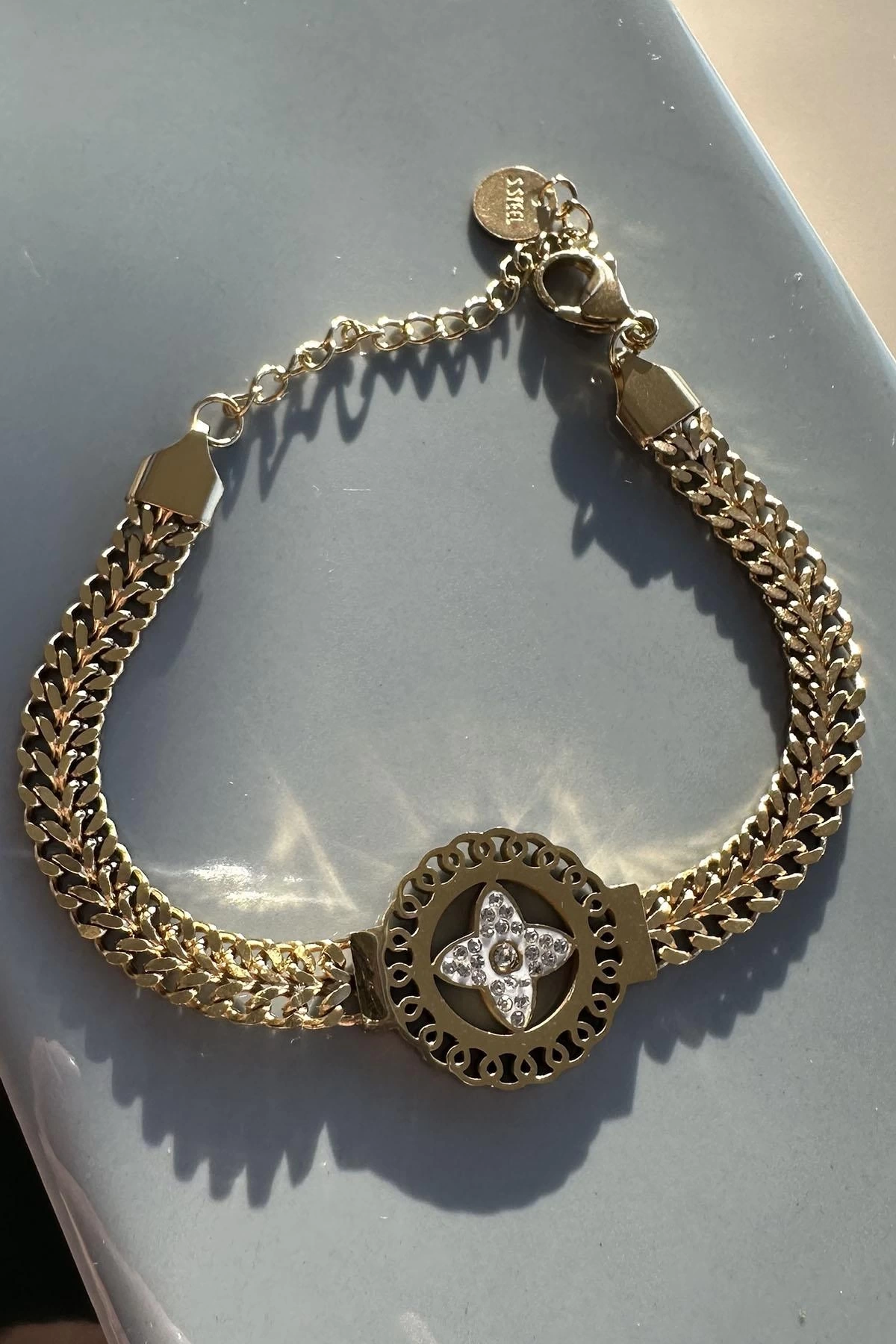 Altın Renk Çiçek Figürlü Çelik Bileklik