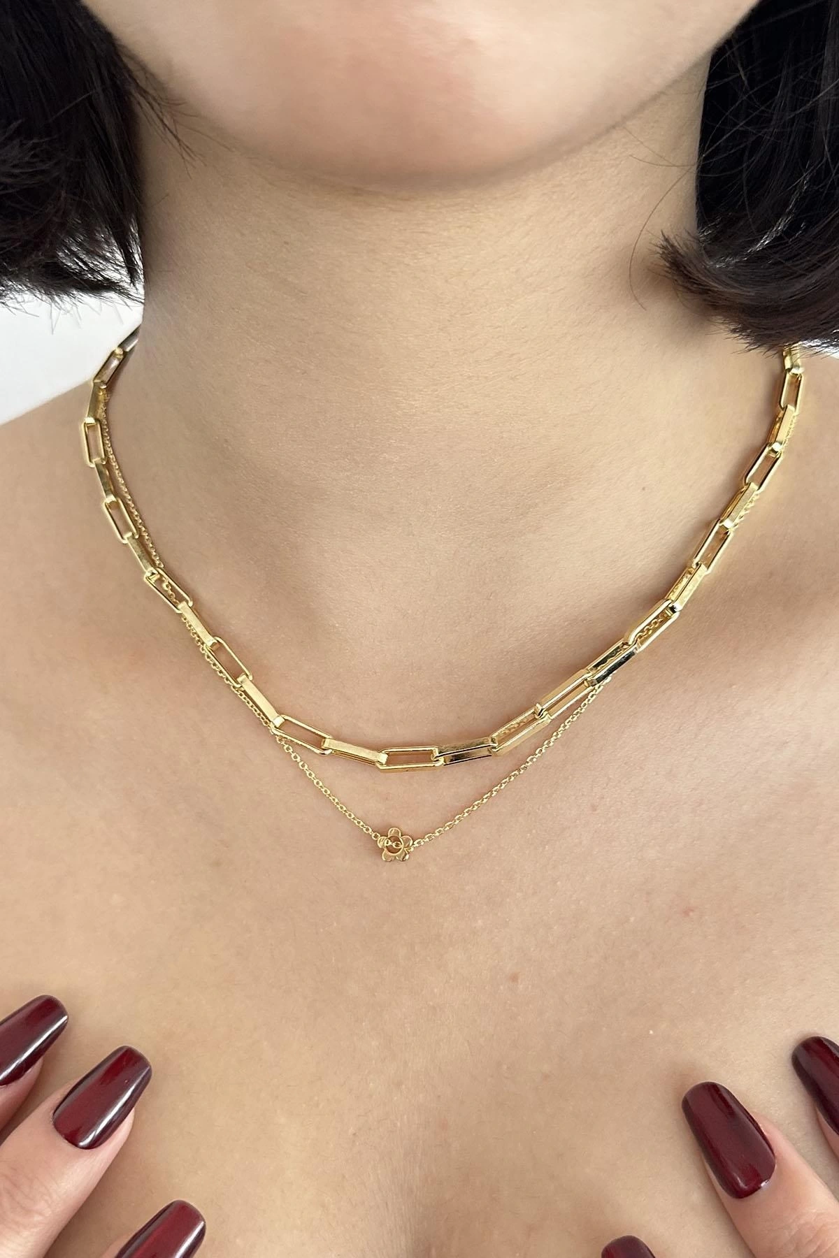 Altın Renk Çiçek Figürlü İkili Kolye