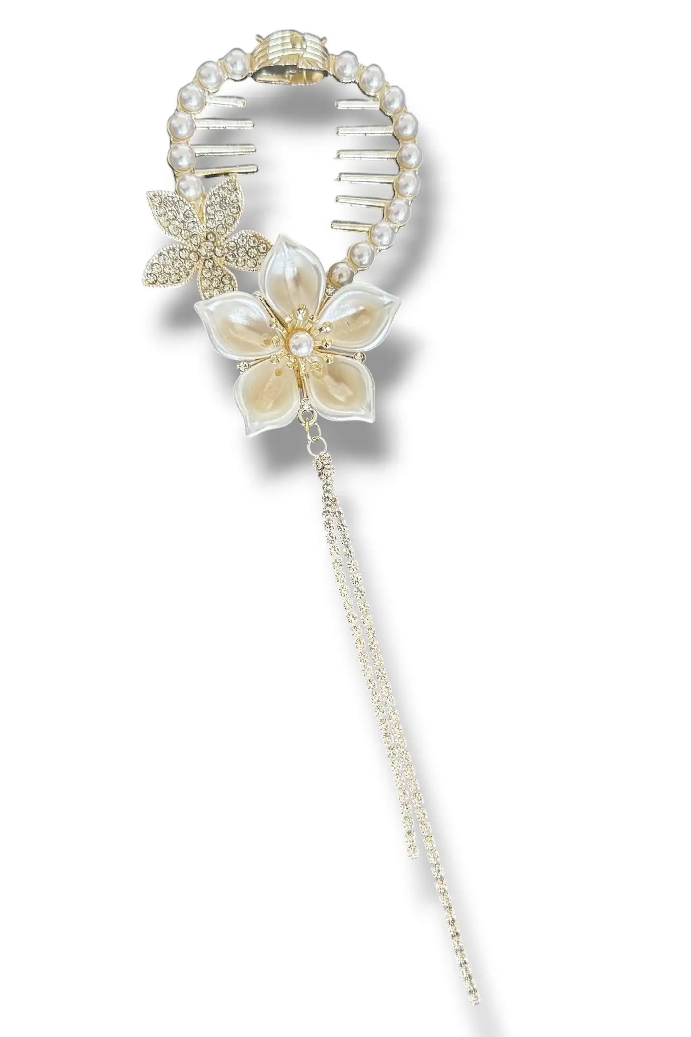 Altın Renk İnci Ve Taş Detaylı Sallantılı Topuz Tokası