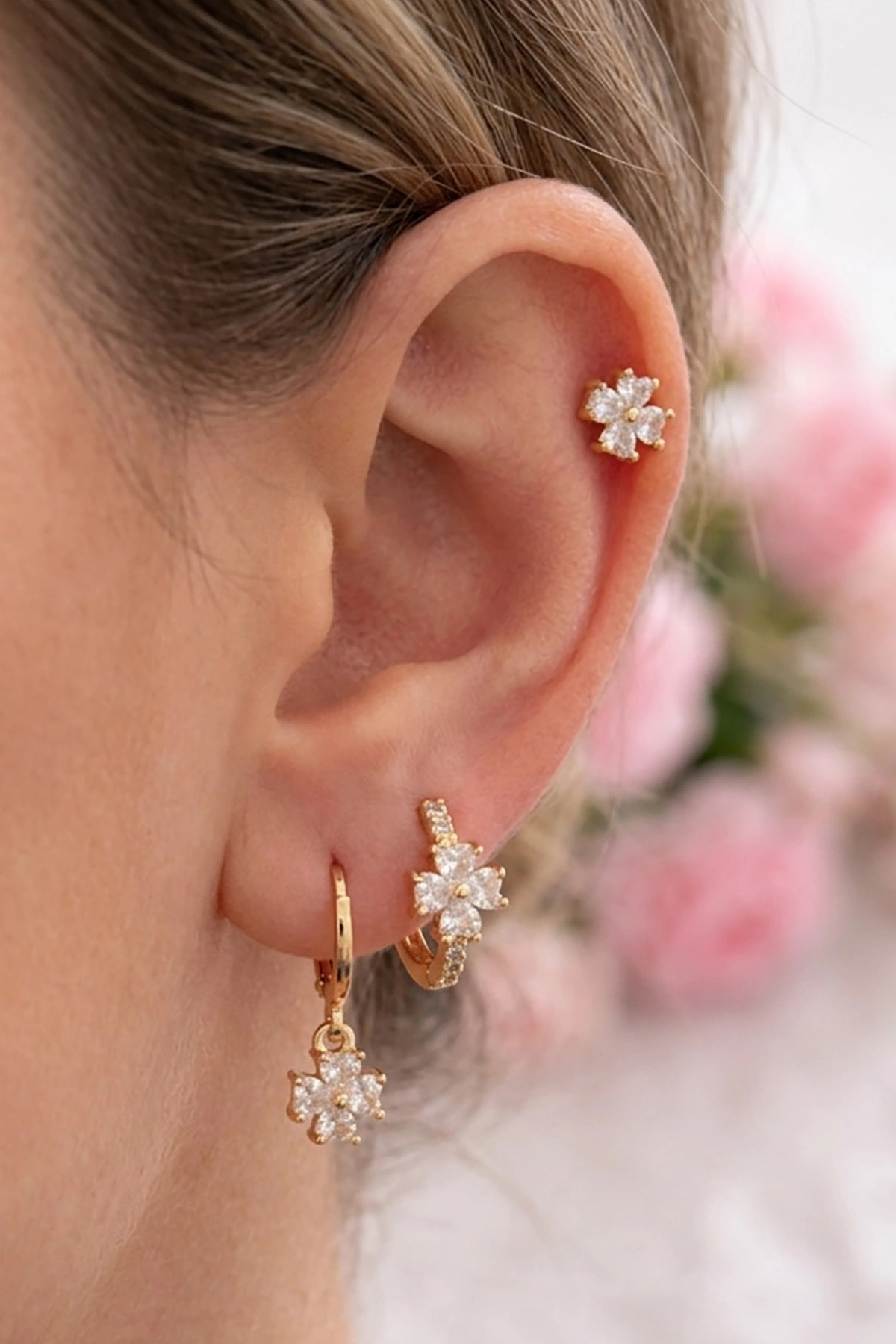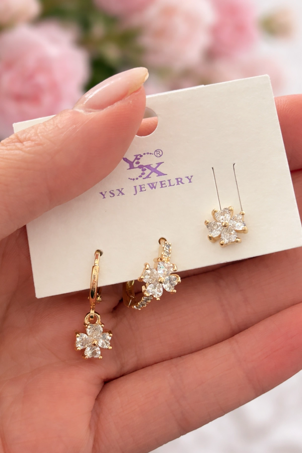 Altın Renk Çiçek Figürlü Taş Detaylı 3'lü YSX Küpe