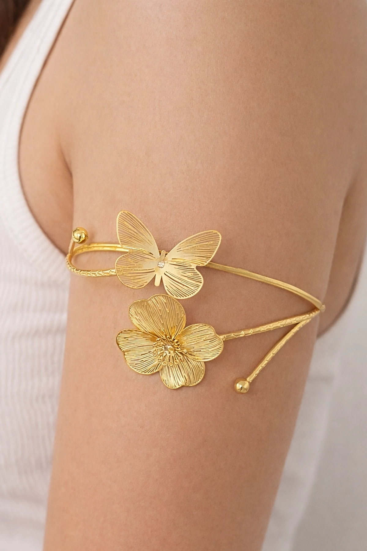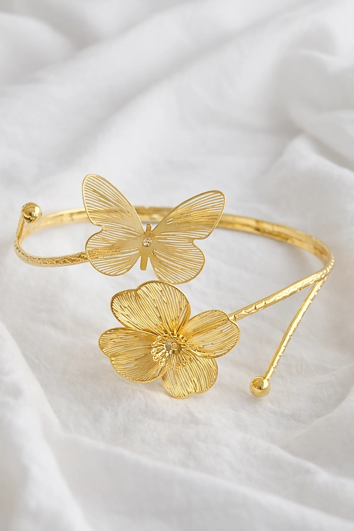 Altın Renk Çiçek Ve Kelebek Figürlü Tasarım Bileklik Kol Aksesuarı