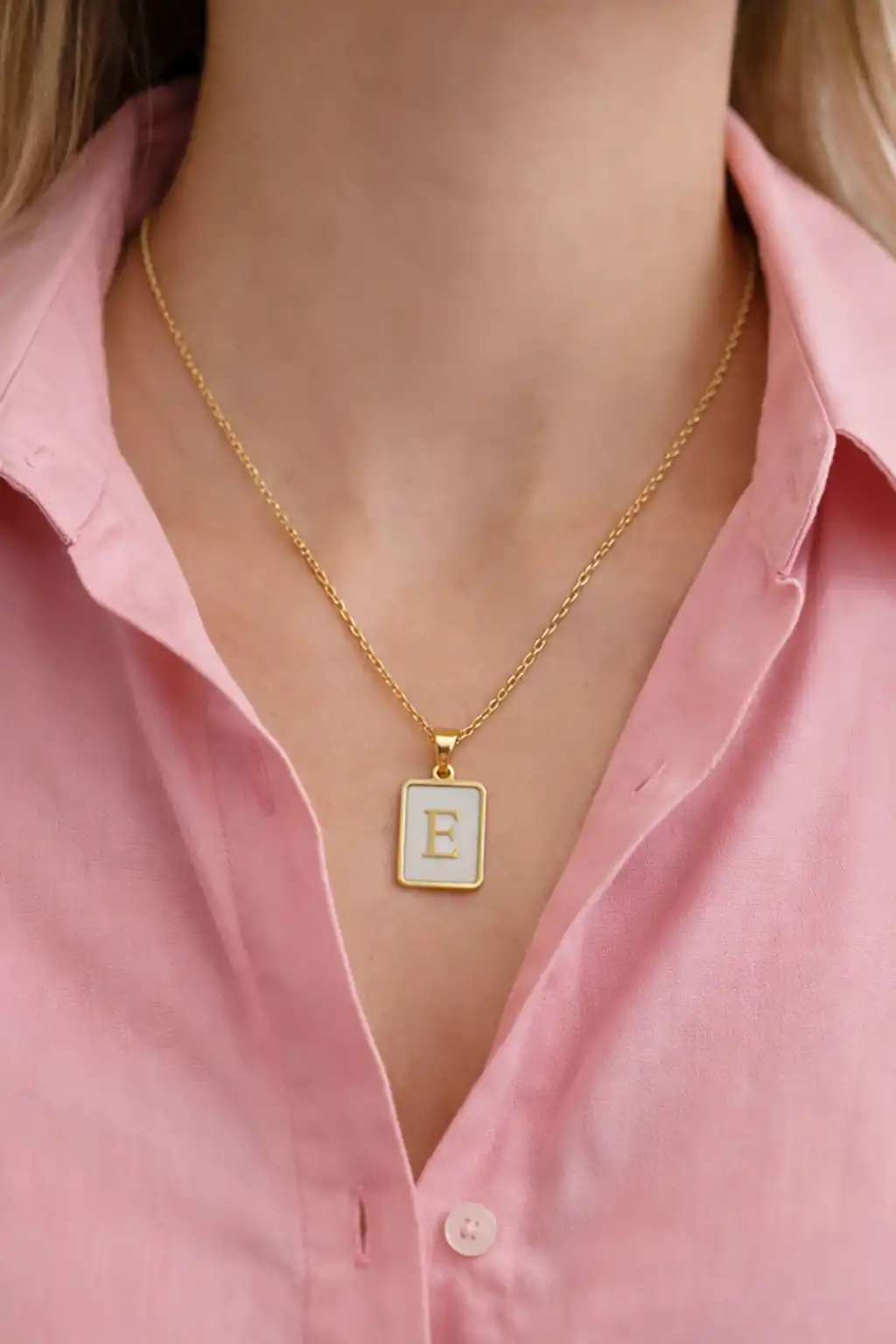 Altın Renk M Harfli Taş Detaylı Çelik Kolye
