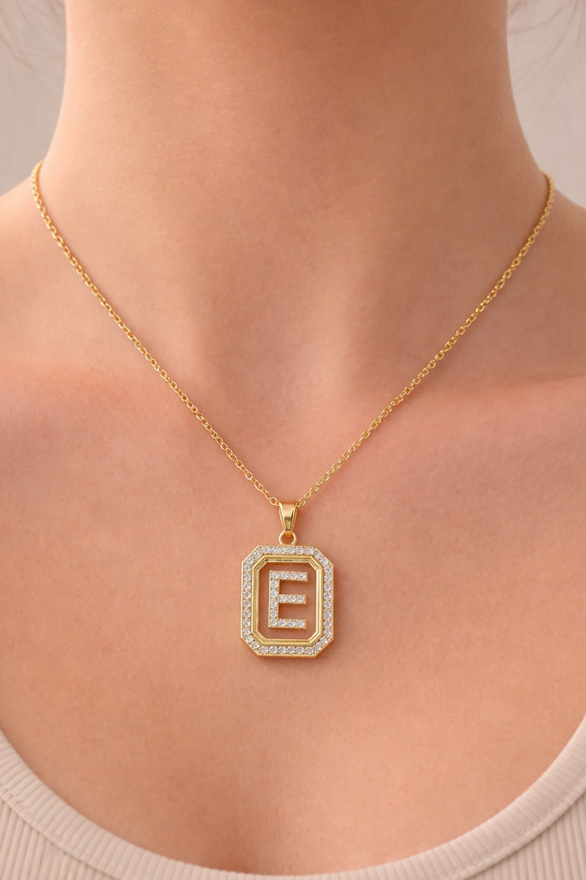 Altın Renk E Harf Taş Detaylı Çelik Kolye