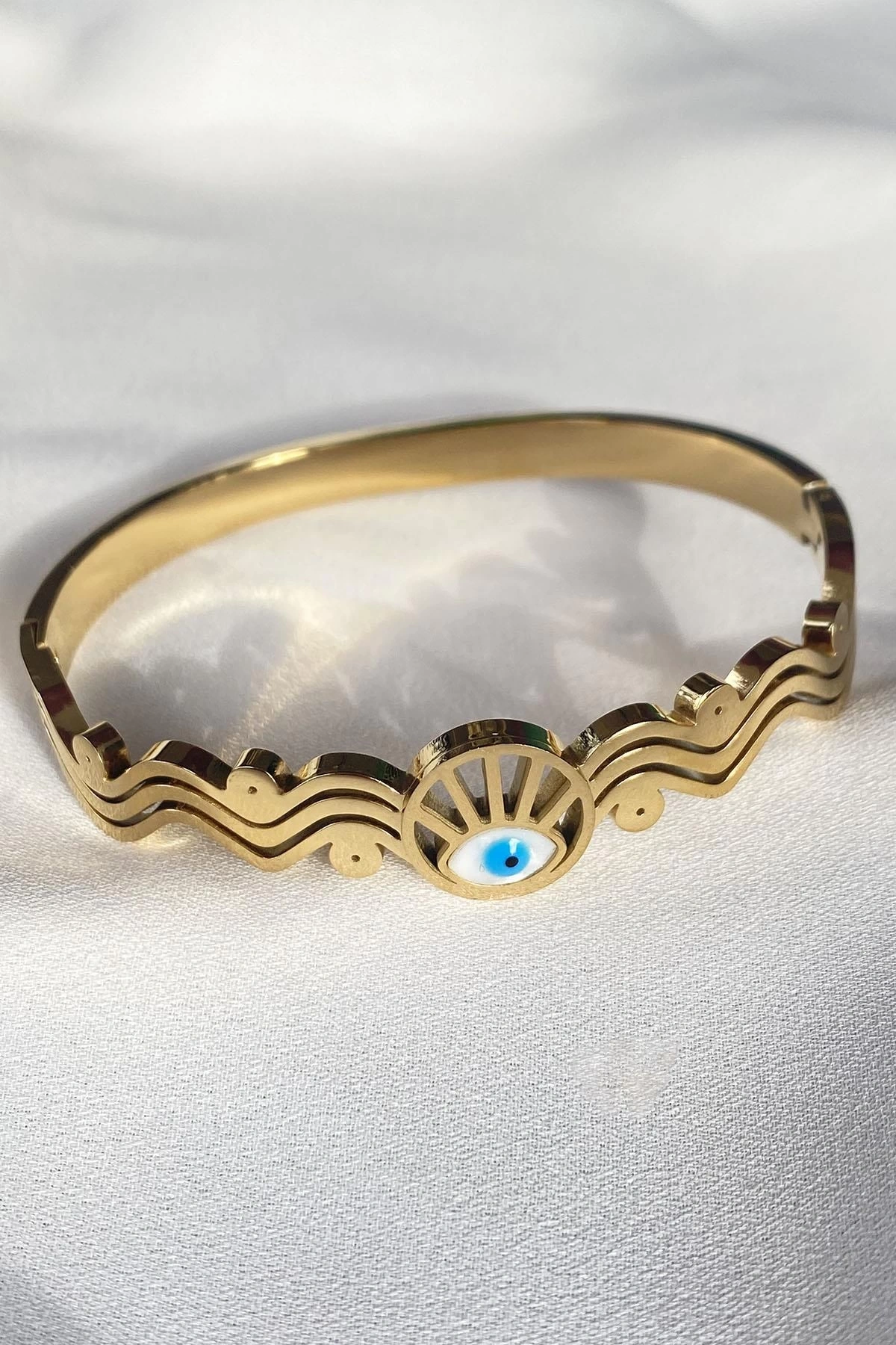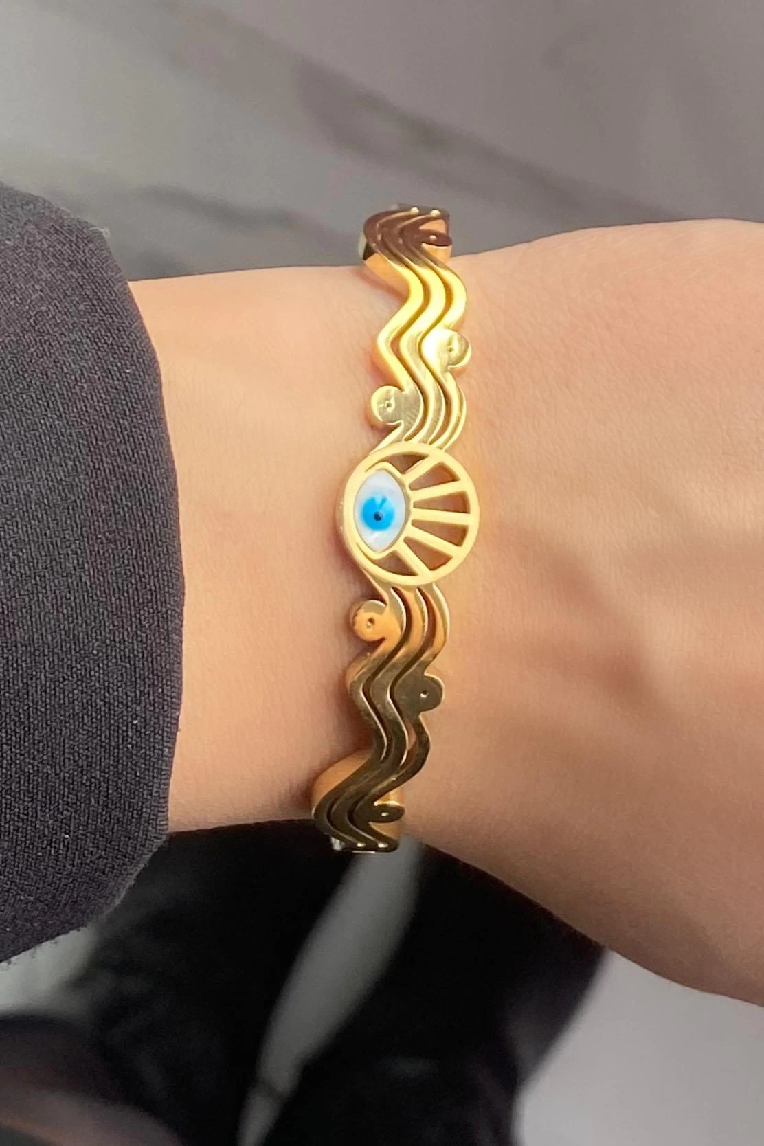 Altın Renk Göz Detaylı Çelik Kelepçe Bileklik