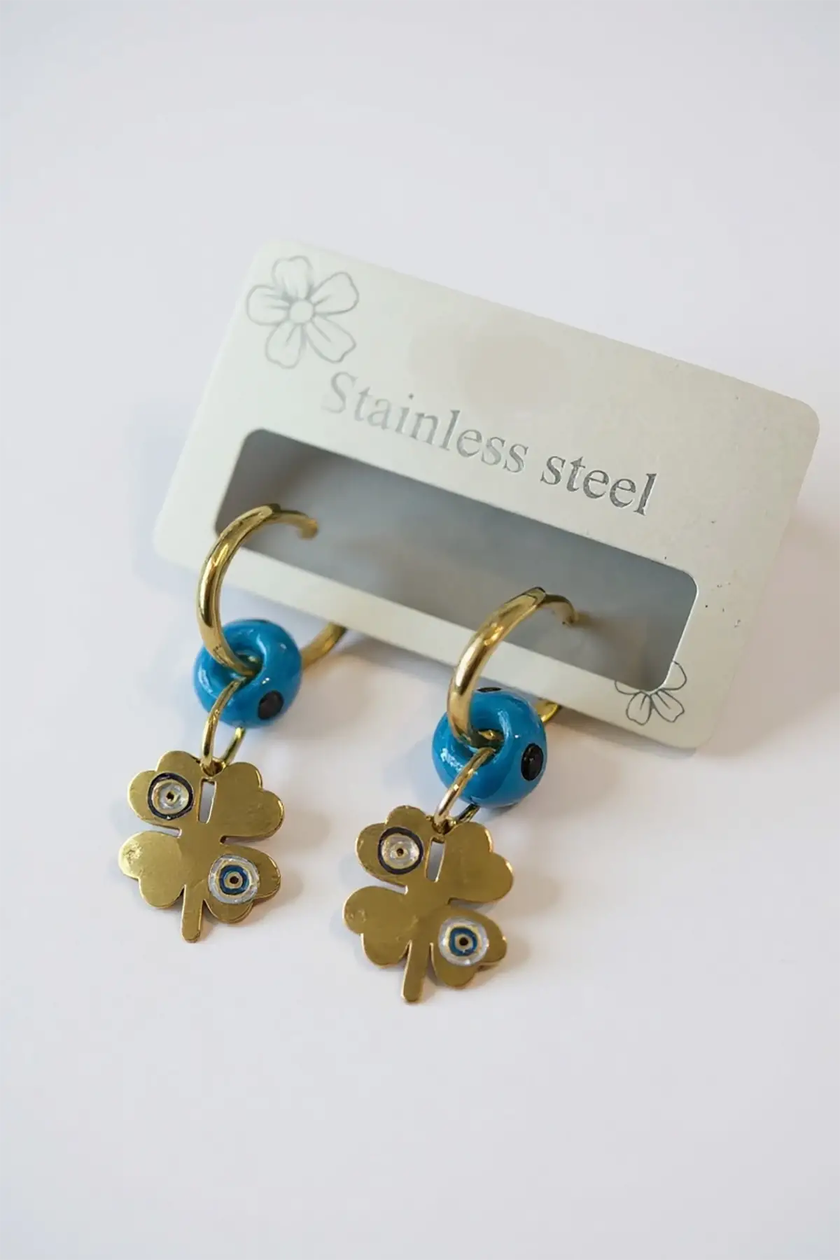 Altın Renk Yonca Figürlü Nazar Boncuk Detaylı Çelik Küpe (Çift)