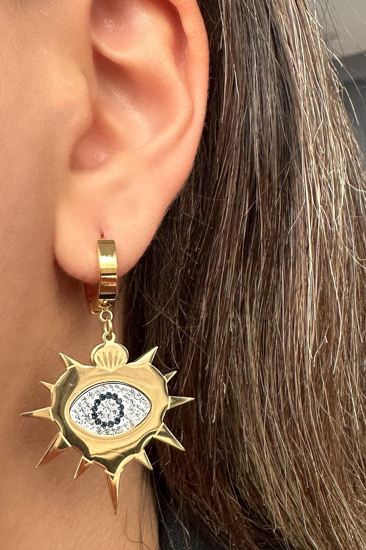 - Zarif tasarımıyla dikkat çeken bu çift küpe, altın rengi detaylarıyla göz alıcı bir görünüm sunar.