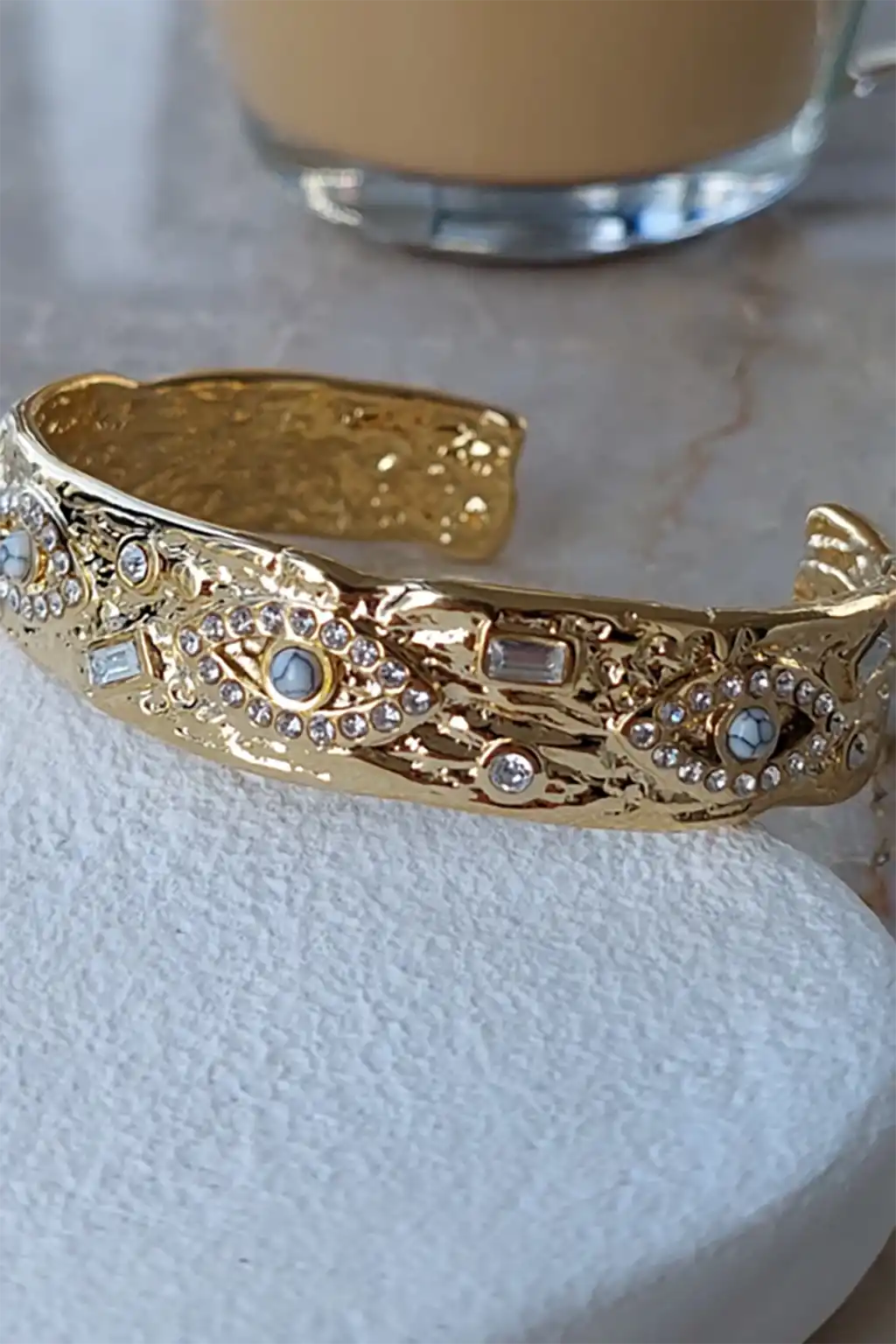 Altın Renk Göz Figürlü Taş Detaylı Çelik Kelepçe Bileklik