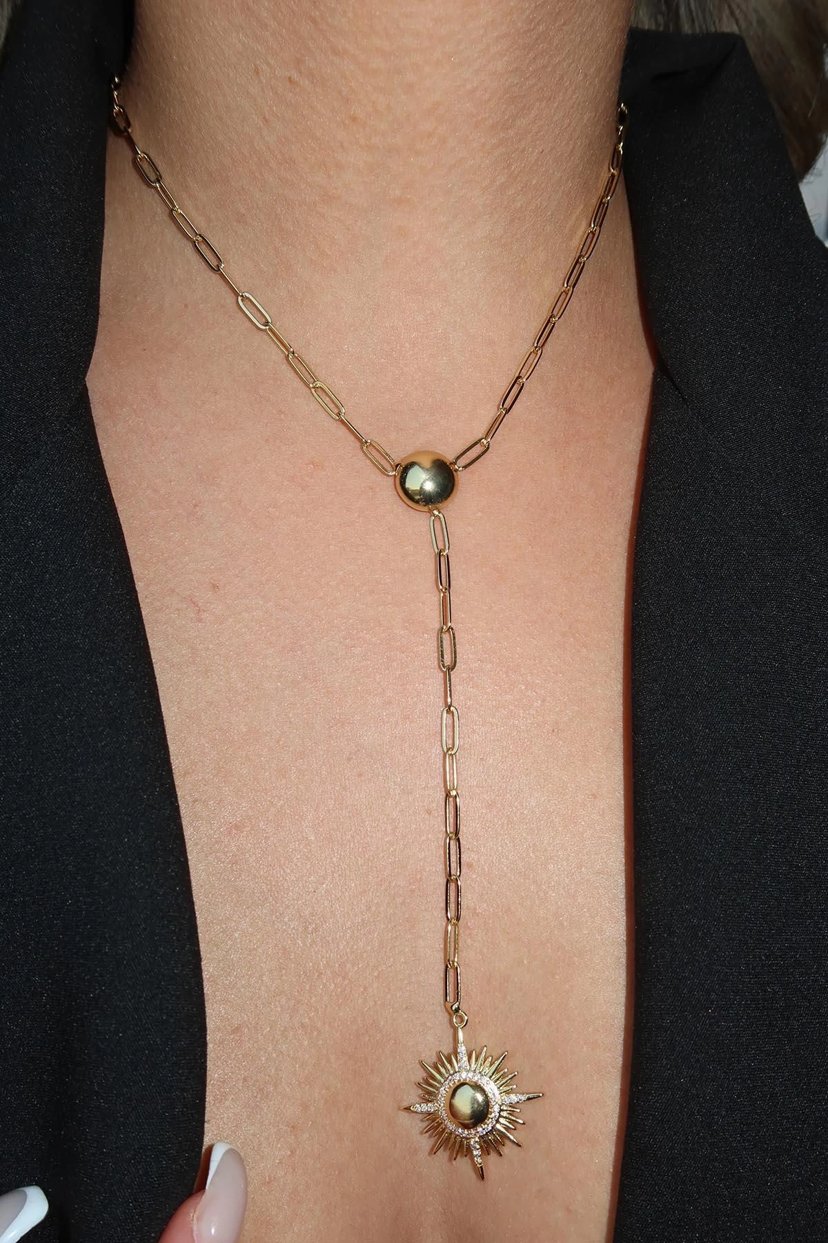 Altın Renk Güneş Figürlü Taş Detaylı Y Kolye