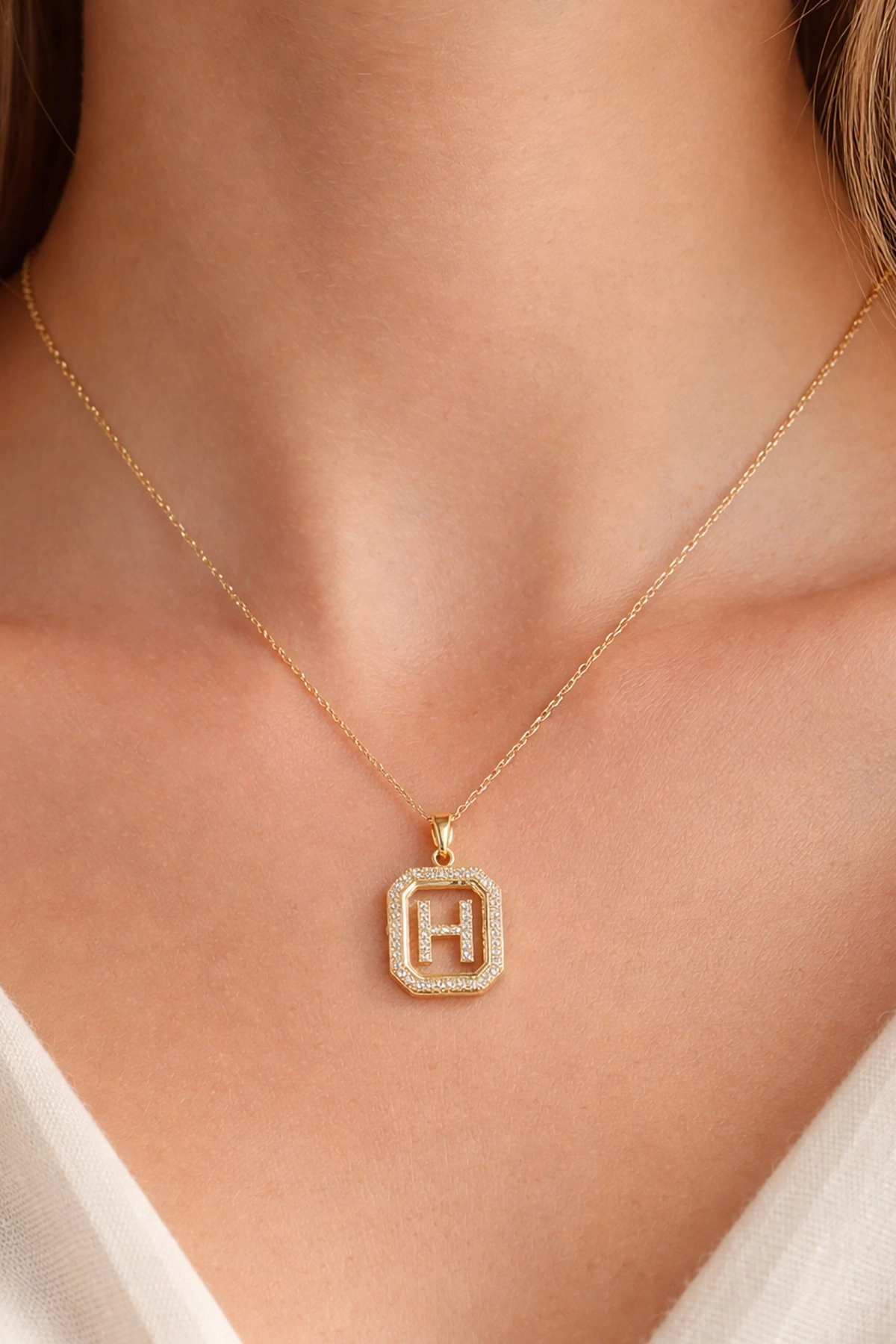 Altın Renk H Harf Taş Detaylı Çelik Kolye