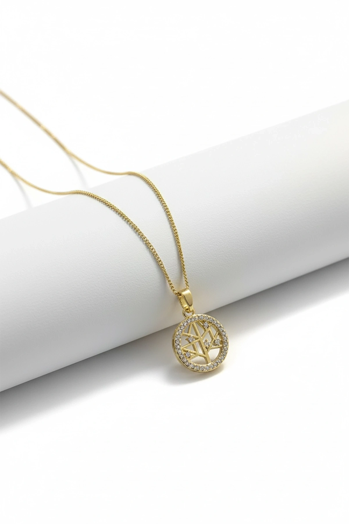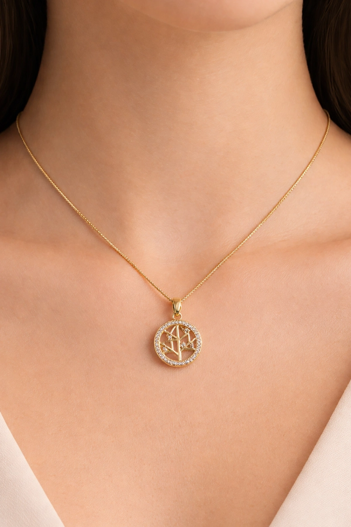 Altın Renk Hayat Ağacı Figürlü Taş Detaylı Çelik Kolye